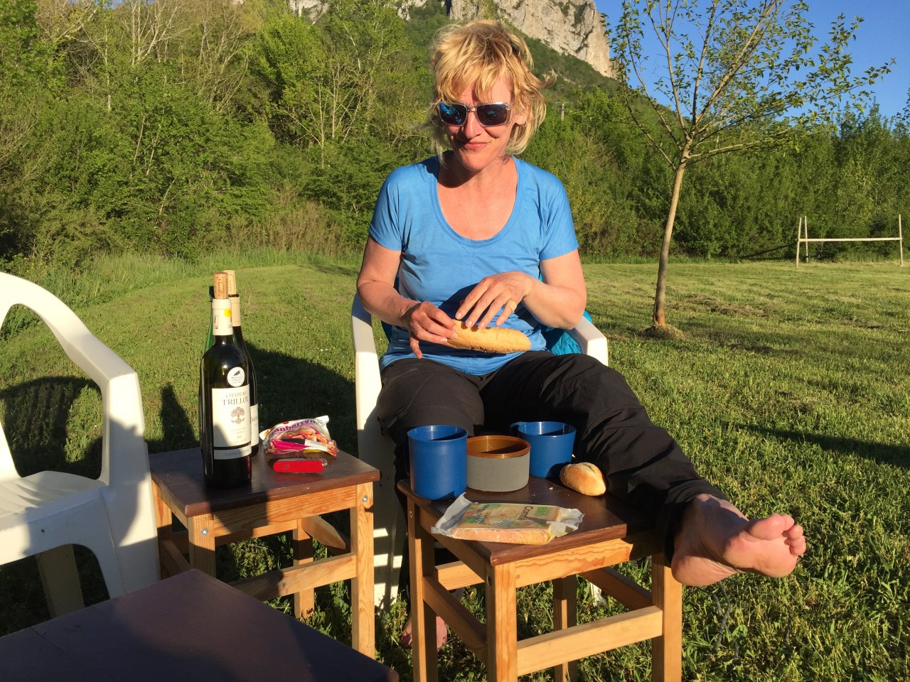 Mini wijnproeverij: restje van fles €9 uit de Boulangerie, nieuwe fles gekocht bij het restaurant €15 en 100m verder aan de kant van de weg bij een stalletje een litertje wijn laten tappen in een plastic Perrierfles voor €5. Samen met oud stokbroodje van twee dagen ervoor en stuk Comte…helemaal tevree!
