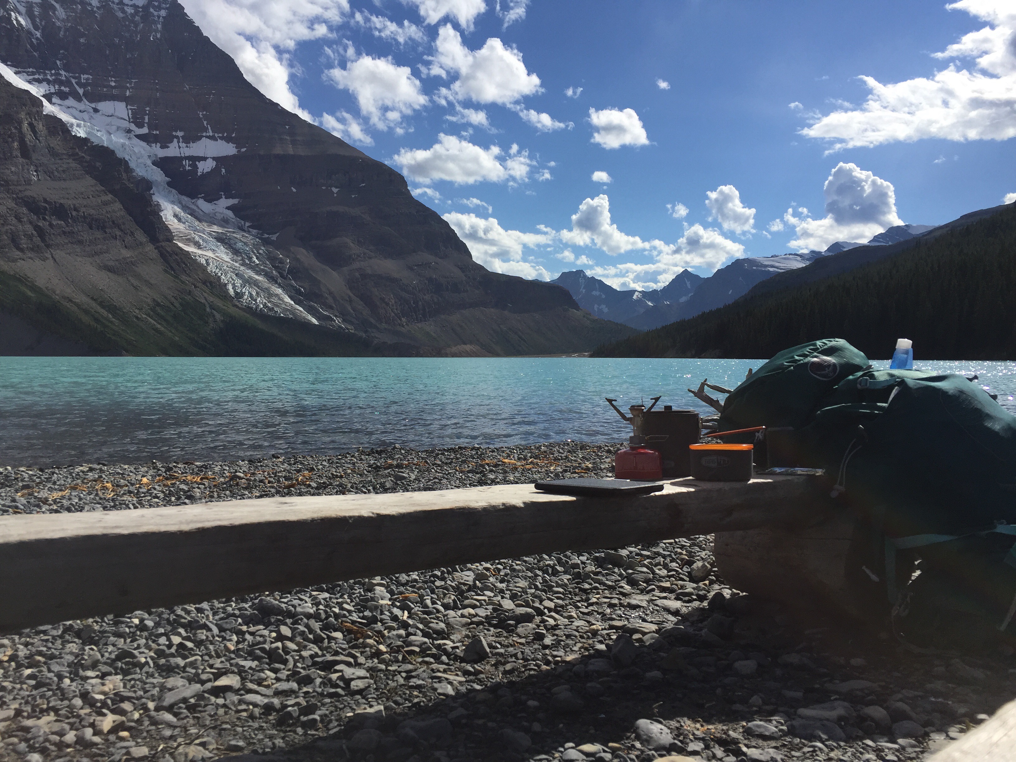 Away from everybody at Berglake in the afternoonThis morning awake at 4.30am at campground Whitehorn along the Berglake trail and walked away, my friend on my back, at 7 sharp! 2,5 hour to get dressed, pee, pack my tent, make breakfast, dump, pack my rucksack and having a little chat with the Canadian. A record was set!