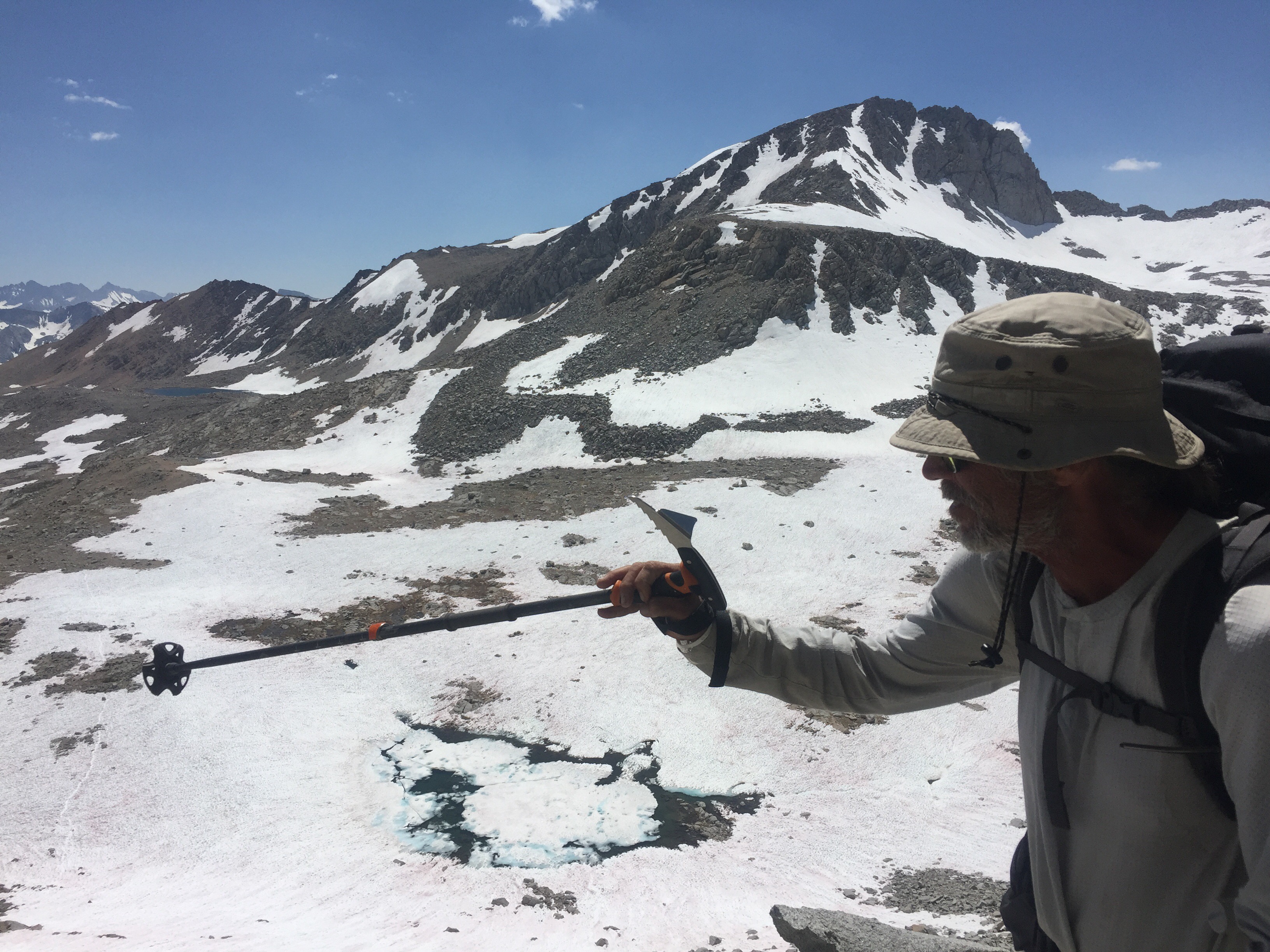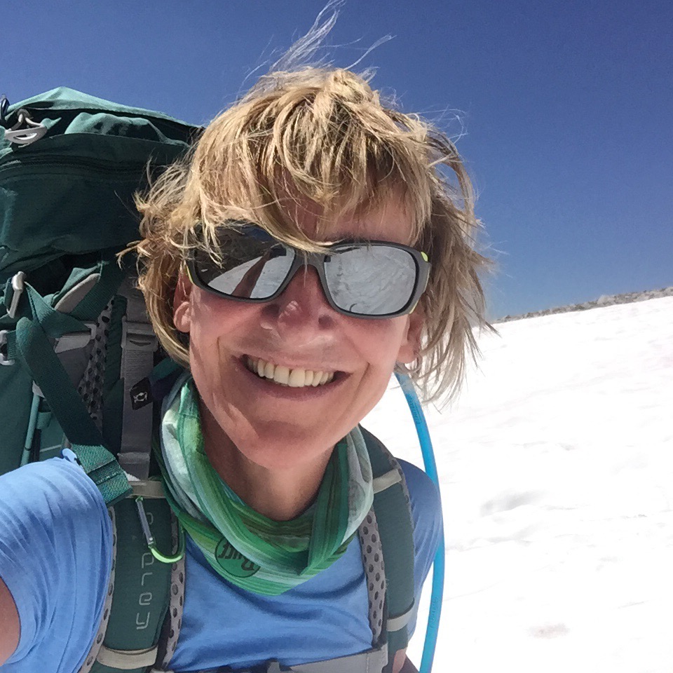 Een soort gatenkaas met heuvels tot boven de knie. Je tilt je ene been dus een halve meter op om in de volgende kuil te planten. Ik begon te vallen. Op mijn rug met mijn rugzak in zo’n kuil, benen in de lucht. Een soort spartellende onderstebovenkever. Het kostte een enorme kracht weer op mijn benen te komen. De eerste keren moest ik er zelf nog om lachen, maar na een uur verging me dat wel. Stap je op een rotsblokje dan schuif je daar af en hup lig je weer. Of je schiet door de sneeuw ineens een halve meter lager. De moed verging me, ik verloor waarschijnlijk elke sense of direction. Ik ben “gered” door GG, hij is van halverwege de pass naar beneden gerockhopped tot ik hem zag en in zijn richting kon ploeteren. Samen weer omhoog geklauterd. Voor deze PCT-er met al 800 miles in de benen een makkie, voor mij een idiote inspanning, op díe hoogte, met díe rugzak, op dat tempo, zulke steile rotsblokken oplopen. Hijgend, kwijlend, duizelig en uiteindelijk misselijk bereikten we zijn punt op de trail waar nog twee vrouwen ons opwachten. Ik voelde me echt rescued!