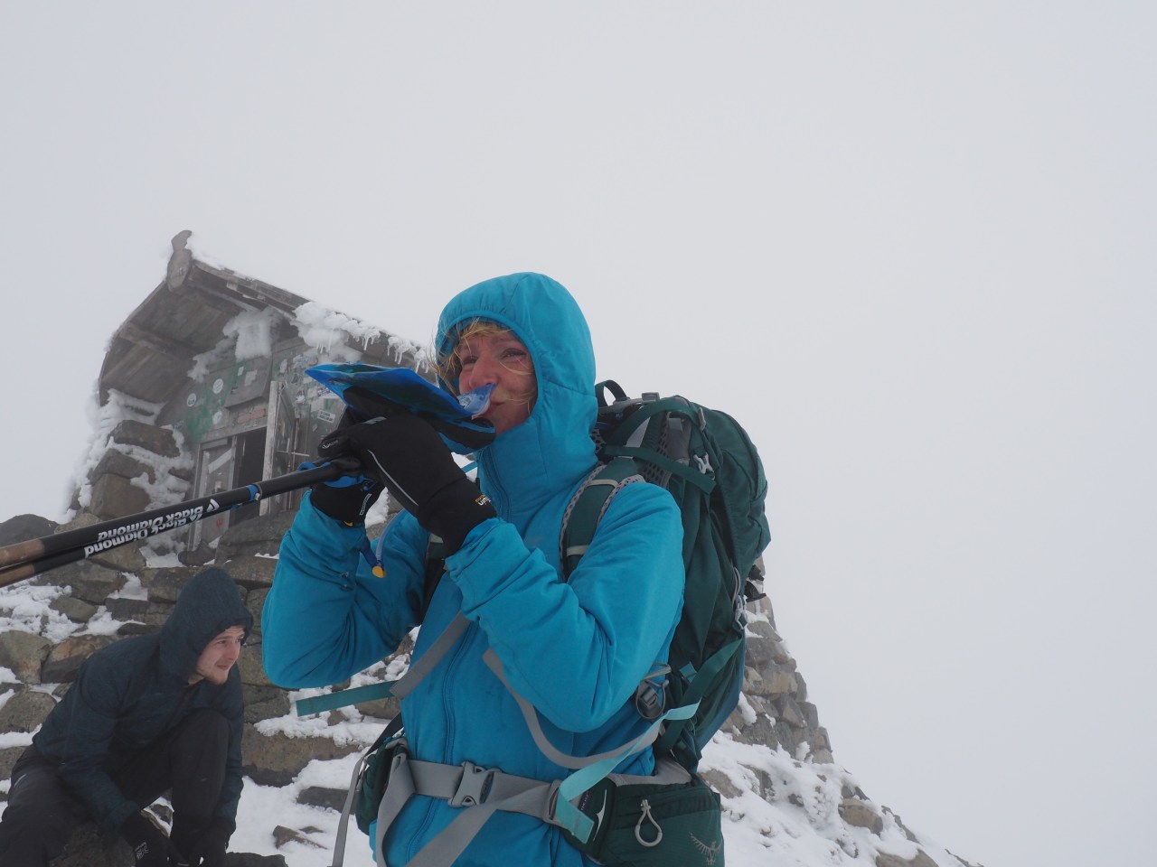 Zaterdag 29/4 Walking Ben Nevis. In Pauls dagboekje staat later: “Good snowpractice for Caro.” Prachtige dag. Topdag. Beste dag van de vakantie. Hier doe ik het voor. Genieten met een grote G. Het is een mix van doorzetten/uitputten/uitrusten/serotinen verzamelen/ vergezichten/euforie/angsten overwinnen/blij zijn/trots zijn/gezond voelen… Aan de start is het erg druk, het is een zeer populaire hike. Je loopt tussen hordes mensen omhoog. Hoe hoger je komt, hoe meer het verspreidt, maar het blijft best druk. Op de top is het zo mistig, stormy weather, en freezing cold dat je de drukte niet ziet, das een voordeel. Normaliter schuw ik drukte in de natuur, maar de positiviteit is te groot om ook maar ergens last van te hebben. Ik ben een schijterd bergaf als het glad is. En dit was als een piste, glad dus.