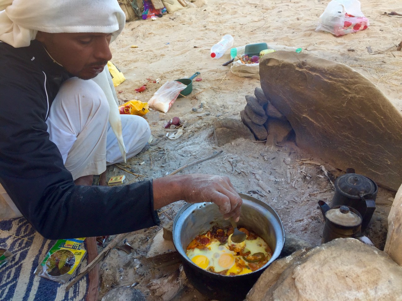 Ik slaap zo héérlijk hier! Vannacht waaide er een flinke wind, wat koeler ook, maar mijn gear is daar zekers tegen bestand. Met jasje aan en capuchon op was het perfect. De avond was rustig, ik heb heerlijk liggen lezen met het Arabisch gekeuvel als achtergrond muziek. Aliwen praat aan één stuk door, wat zou ie toch allemaal zeggen tegen zijn zoon die maar af en toe iets terugmompelt? Heel gemoedelijk allemaal. Ik heb ondertussen gehoord dat Bedoeïnen altijd aan één stuk door praten., dat is de cultuur, iets met mondelinge overdraging. Wat een geluk dat ik de taal niet spreek en me heerlijk kan terugtrekken. Om 6 uur is het echt donker, misschien al 5 uur zelfs, ik leef niet met de klok. Ik schat dat ik om 9 uur slaap en 6 uur op ben.