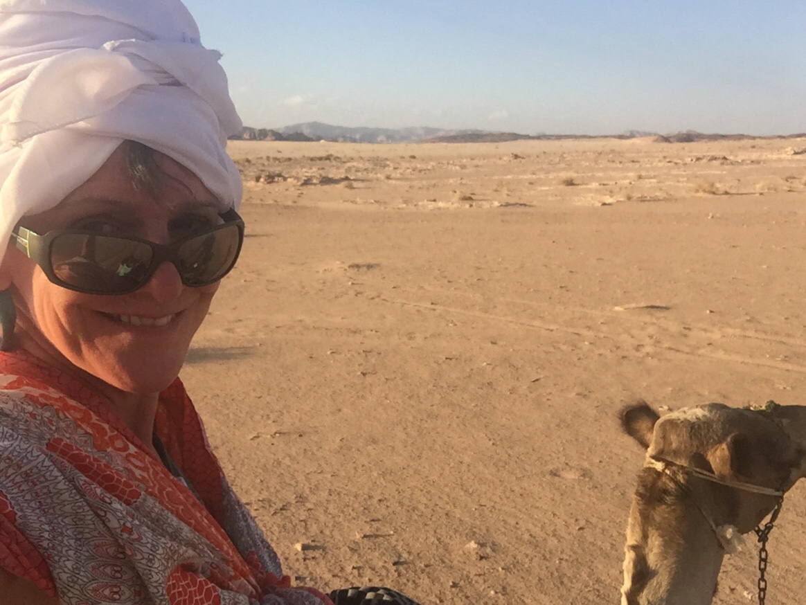 als een prinses te gedragen. Want ik schommel weer door de woestijn, gesmeerd en gelapt doorsta ik de brandende hitte. Ik ben ook erg blij met mijn anti-sneeuwblindbril van een vorige reis.