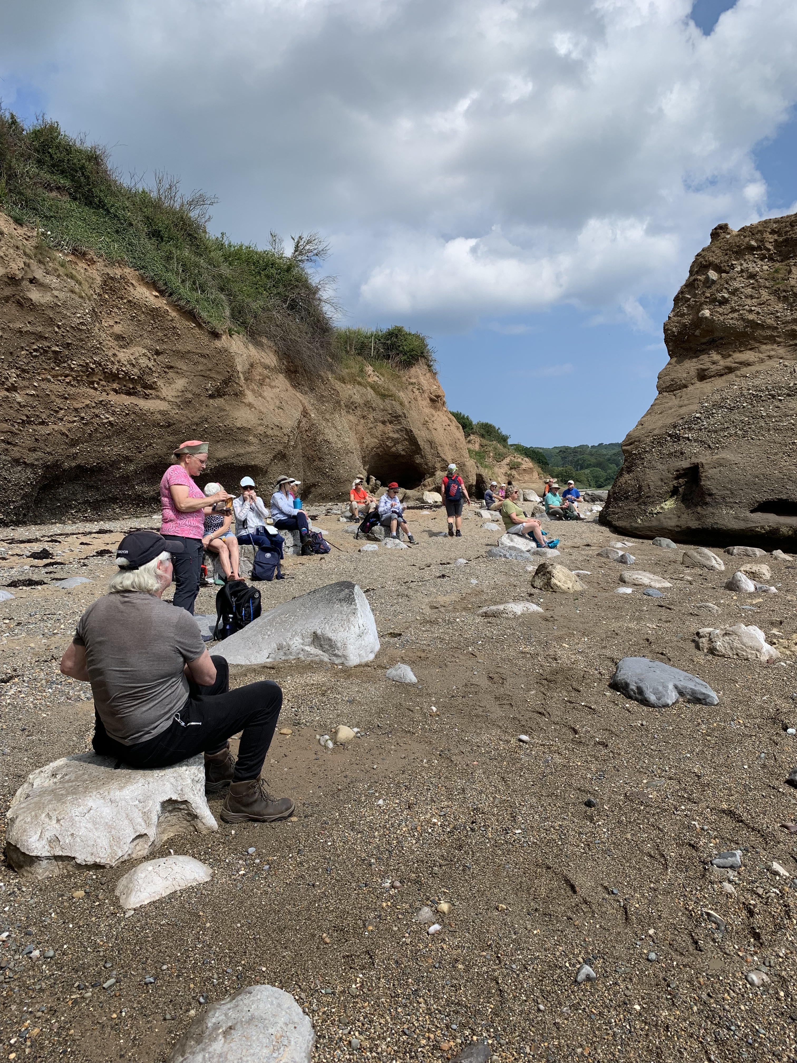 Ik ben op weg. De foto’s vertellen het verhaal. Ik wandel, alleen, en dat is helend, voedend, blij makend, ontspannend, vermoeiend soms maar zonder meer positief. Ik geniet van het pad. Na een uur loop ik op het strand langs een strandhuis waar 3 mensen op de veranda zitten. Ze bieden me een drankje aan. Huh? Nu al. Ik ben net op weg. Nee, ik voel heel duidelijk dat ik lekker alleen net vertrokken ben met de blik en gedachten vooruit. Ik bedank vriendelijk. Een van de drie blijkt daar wel neergestreken te zijn, wandelt ook het Coastal Path, maar moest terug vanwege het tij. Je kunt er nog niet door hoor, waarschuwt ze. “Oh, ik zie wel”, zeg ik en wil al doorlopen. Ze springt op en wil met me mee. NEEHJ….. neehj..niet een kwekkende giechelende buurvrouw aan mijn zij….Maar ze is er al. Ja hoor, ze heeft een wandelmaatje gevonden. Het vragensalvo start en ik geef overduidelijk niet aanmoedigende antwoorden. Bij het punt aangekomen waar de vloed de doorgang blokkeerde is de eb ingezet en kan ik over zojuist drooggevallen rotsblokken op het strandje om de hoek komen. Daar blijkt een hele Engelse wandelub neergestreken, zo schattig. Ze zitten allemaal op hun eigen rotsblokje met hetzelfde lunchpakketje op schoot, allemaal een hoedje op, gezellig te keuvelen. Kijk, dáár wil ik graag even een babbeltje mee maken.