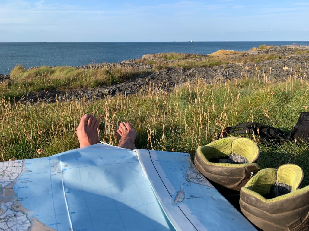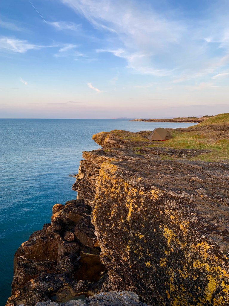 I start hiking again…it showed 15 km on my app…what is in fact a bit my average distance, 10 miles. I felt like I could do another 15…..but…I was a bit overenthousiastic there….all of a sudden I got tired. So i had to look for water. 2 liters I need at least for a comfortable evening and morning for my evening tea, diner, morning coffee, porridge and brushing teeth. Nothing came along….nothing….kilometers later I passed a house, lady on the terrace, she loved to give me three liters. Huppakee 3 kilo on top I sloffed on. Happy though that I could fall down everywhere now in fact…. what I also almost did. I walked a wrong road nicely 1 km downhill..i had ignored a “private” sign…it ended on a perfect campingspot, beautiful cottage, flat green grassfield, nice terras with a table and chairs…view straight to the seaside far below…. But I didnot have the guts to pitch my tent in their perfect garden, they could come home any moment maybe….so …shitty enough…I had to get that road up again. And then I got a moment of misery…So tired, it was already past 7pm. I know it is not done to camp close to the official Coastal Path, but after 21,5km I had no other choice… 5 meters besides the path, there I was, bit embarrassed, hoping nobody would complain. Hours later, when I was completely installed, a local lady came to me and was or nosy or realy concerned…”Ma’am….are you sure you wanna stay here, you are ahwfully close to the cliff…if the wind comes…” . Wtf…are you saying that i can be blown away here??? She took here phone out, did some research and said that i probably would be fine. Grrrrr….I hate this afraidmakery. Now I was of cours more concerned when I heard any wind noise. She spoiled it a bit for me. But only a bit haha. I am very good in Ostrichpolicy, if i do not want it to be dangerous, because i am too tired to move, then it is save!
