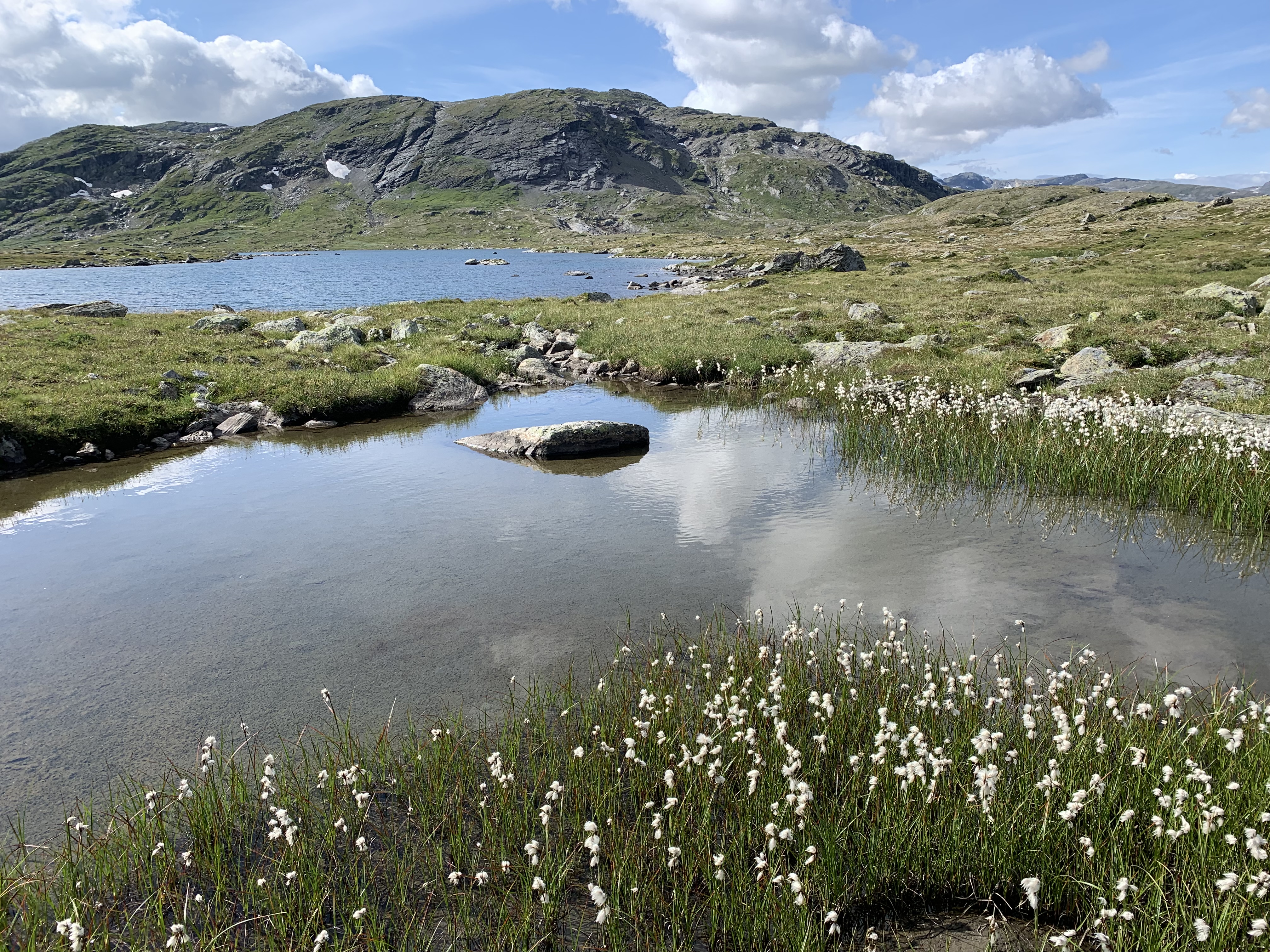 Ik kom om 17 uur aan bij de hut die voor alle wandelaars hier dan de eindbestemming is van deze trail. Prachtige hut trouwens, zou er zo een kamer willen boeken. Maar ik houd het bij een 250ml ijskoud vruchtensapje en een hete thee (90NOK=€9). Sokken drogen, voeten en rug ontspannen op een bankje en even niks doen. Er komen in het half uur dat ik daar zit nog zeker 10 mensen aan, de hut zit waarschijnlijk vol. Ik pak weer in om een gratis plek te zoeken langs de route voor mij&tent. Ik heb gekampeerd 3 km verder dan de Geitterhutta. Niet zo’n inspirerende plek, maar knieën lieten zich nu toch echt horen. Het stilstaande plasje hier nodigt me niet uit om van te drinken en mijn camelbak er mee te vullen, maar om koffie van te maken prima. De zon maakt me wakker om 7.45 uur, goddank een lange nacht gemaakt. Ik ben mijn tent net uit, korte broek al aan….wolken! Zit nu dus te rillen op een kei met mijn capuccino want de ochtendtemperatuur is weer niet superhoog. Ik heb totaal geen bereik hier, kan niks opzoeken, lekker rustig ook wel. Appen met Paul om welterusten te zeggen en goedemorgen hoeft dan ook niet en dat is nét ietsje meer op mezelf. Ik kan niet blijven zeggen hóe bijzonder en gezond dat voelt. Het was een zeer intense eerste wandeldag, qua lengte, qua gewicht op mijn rug, qua terrein en qua indrukken. Prachtig zonnig weer, niet gevallen of geslipt en genoten van het landschap. Ik ben tevree in Noorwee!