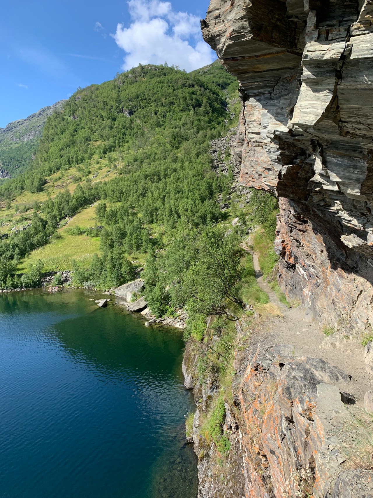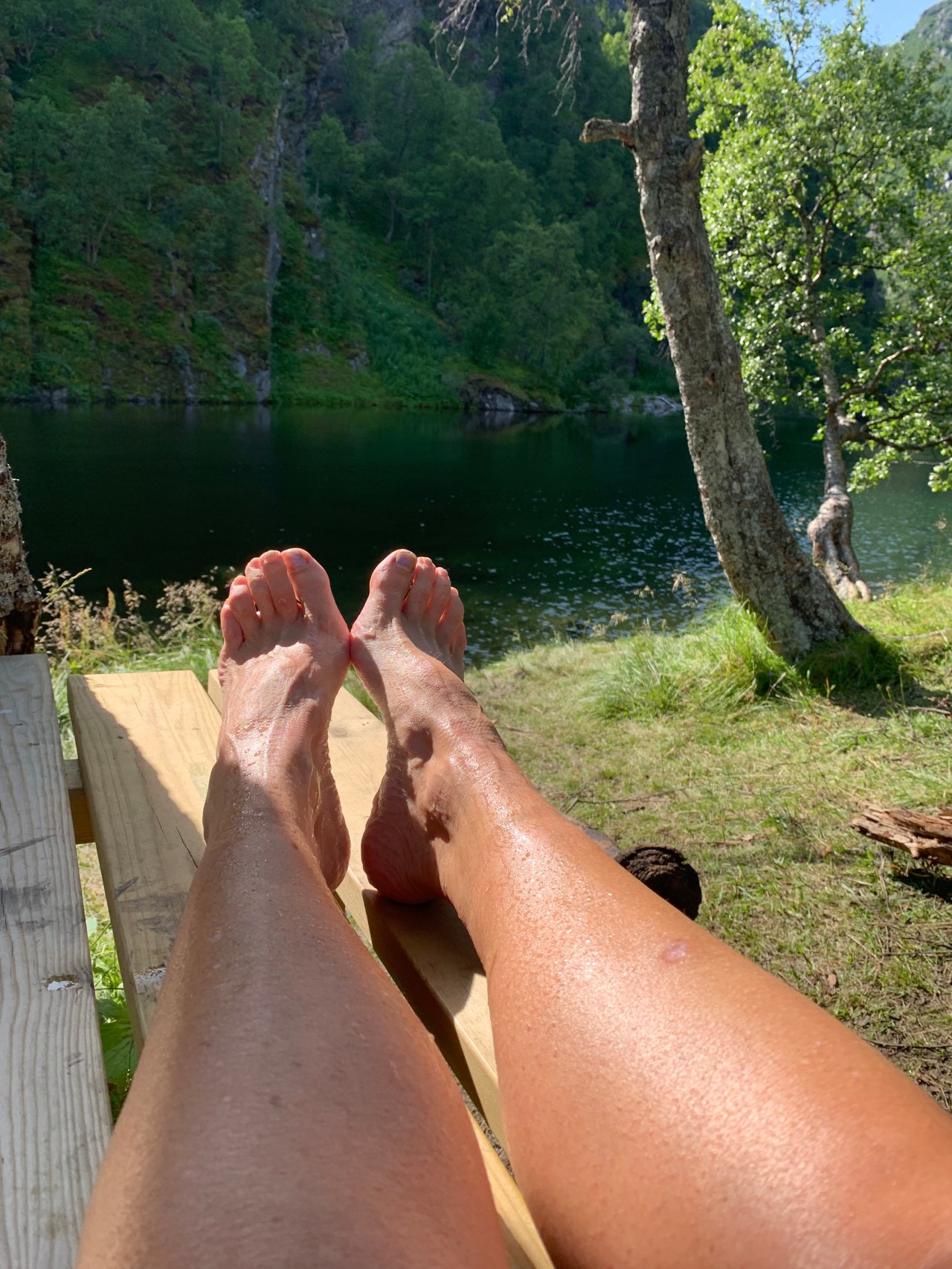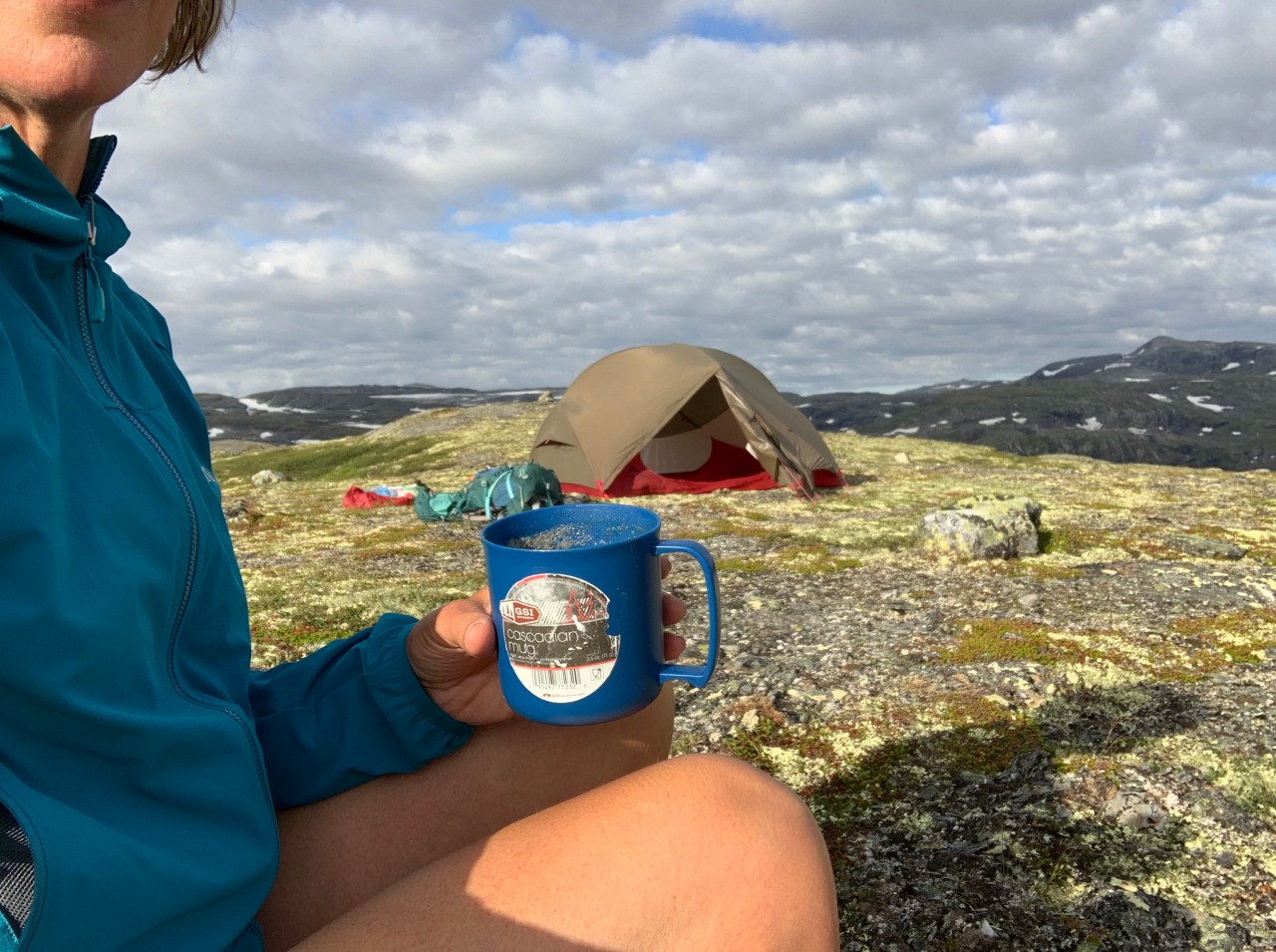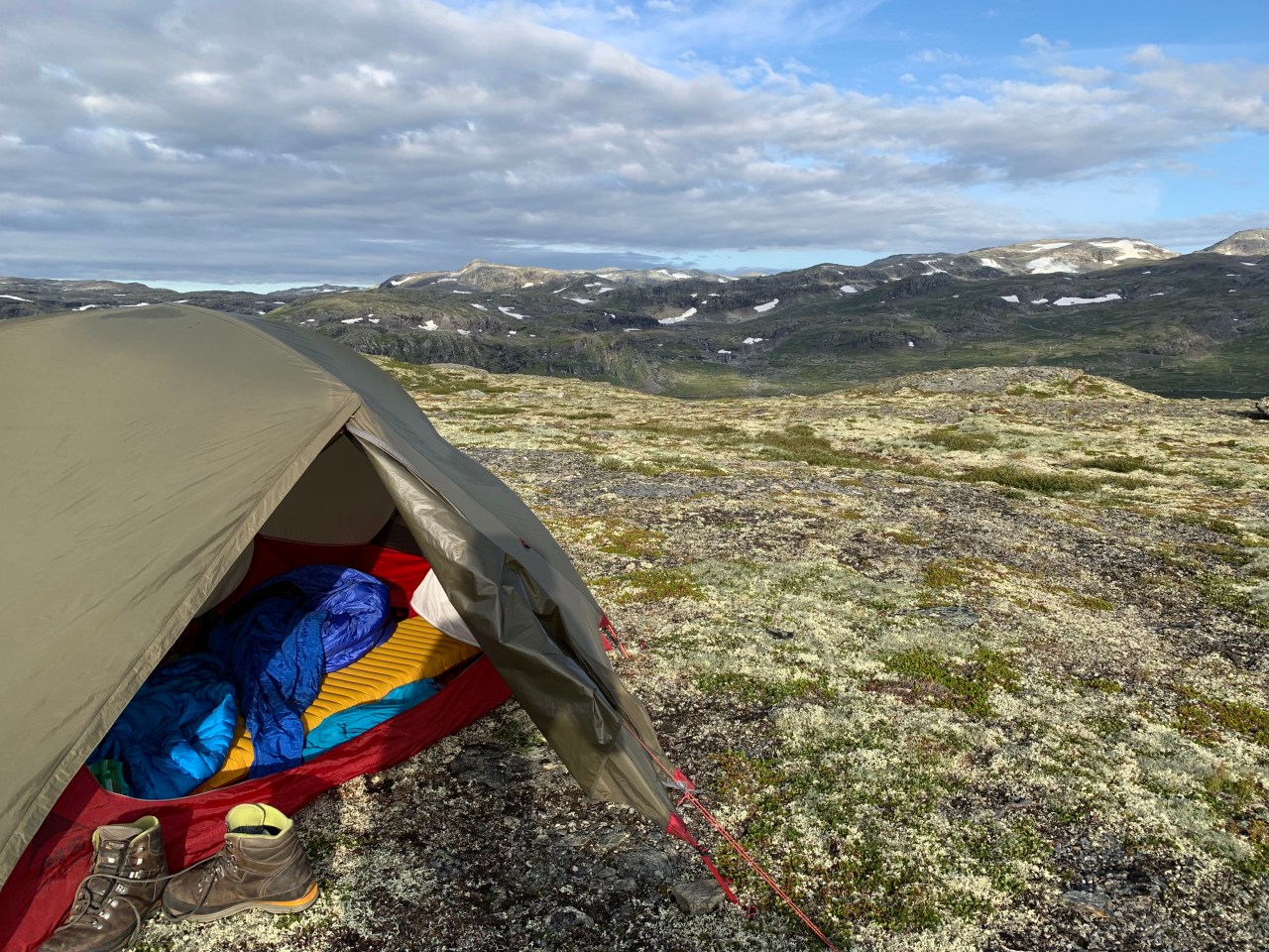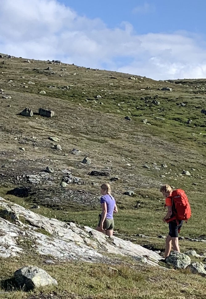 Ik vind zo’n plek…maar net iets te vroeg. Na een uurtje hier is het half zes, de zon verdwijnt hier ook en ik besluit nog iets verder te gaan. En dat…ai…was de verkeerde beslissing. Er komt geen enkele mogelijke plaats meer waar ik mijn tentje kwijt kan én waar water is. Ik heb nl geen water meegenomen want dacht nog meertjes genoeg tegen te gaan komen. Ik loop echt het snot voor mijn ogen op een smal brokkelig pad tussen veel nattig groen, beetje oerwoudgevoel. Ik passeer een bezienswaardigheid waar de laatste hutjuffrouw me op had gewezen: “daar moet je even heen lopen, klein beetje van de route af”. Dat stond voor morgen op het programma, ben ik daar nu al? Toch maar even gaan kjjken, rugzak bij de paal…en oh wat loop je dan ineens vederlicht over de rotsen te huppelen. Ik hoor stemmen… Een hele, nee twee hele Noorse families zijn daar neergestrekken, op de enige enigszins vlakke en droge plekjes. Ik voel me “in nood” en zeg dat ook dat ik desperate op zoek ben naar een slaapplaats. Ze zeggen dat ik gerust rond kan kijken of er nog een stekkie is. Ik twijfel…het voelt zompig daar waar het enigszins vlak is….Ik loop wel drie keer besluiteloos rond. Ze zijn ook absoluut niet spraakzaam, spreken nauwelijks Engels misschien. Ik ga eerst maar es water halen 500m verderop, zonder rugzak een lekker loopje. Op de terugweg word ik ingehaald door een jong Noors stelletje en dit is het eerst open spontaan verkwikkend contact van deze reis. Zo’n twintiger, open blije snoet die meteen geïnteresseerd is in … álles haha. Komt ie ook nog uit het Noorden, is een climber (natuurlijk, wat moet je anders daar) en vertelt honderduit over de Lofoten. Ik word er helemaal weer opgewekt van. Ik leid hen naar de grot, hij is daar enorm enthousiast over, klimmen in grotten is zijn hobby…Bij de grot zeg ik ze gedag, zij “wandelen” nog even verder met die jonge klimmersbenen, hij bedankt me oprecht voor het leuke praatje en ik hun natuurlijk. Zo’n typisch travelcontact wat reizen zo leuk maakt. Ik zet met iets minder zwaar gemoed mijn tentje op het verende mos. Klinkt lekker, maar je voelt je toch een beetje in het moeras wegzinken. Ik droom s’nachts dat ik op een laagje water drijf in mijn tent, alsof ik dobber op mijn airbedje. Serieus! Zo gerust was ik er blijkbaar op. Het wordt langzamerhand tijd dat ik de naam van mijn blog ga aanpassen. Het gaat toch allemaal niet meer zo unafraid deze keer. Ik ben echt heel opgelucht als s’morgens slechts wat vochtigheid is opgetrokken…wel dóór mijn grondzeiltje. Ik denk dat ik die voor een volgende reis ga laten vervangen bij een tentmakerij, het is te vaak nattig op de bodem. Ik wil zo snel mogelijk weg van deze plek, ik sta de dicht bij de families, kan niet gewoon een plasje doen naast de tent…..last staan een poepie. En de zon schijnt achter de berg. Nee, ik pak meteen in, de zon schijnt verderop wel op het pad en ik heb zin om te lopen. De laatste etappe is nog maar 11 km! Ik voel me sterk ren naar de zon.