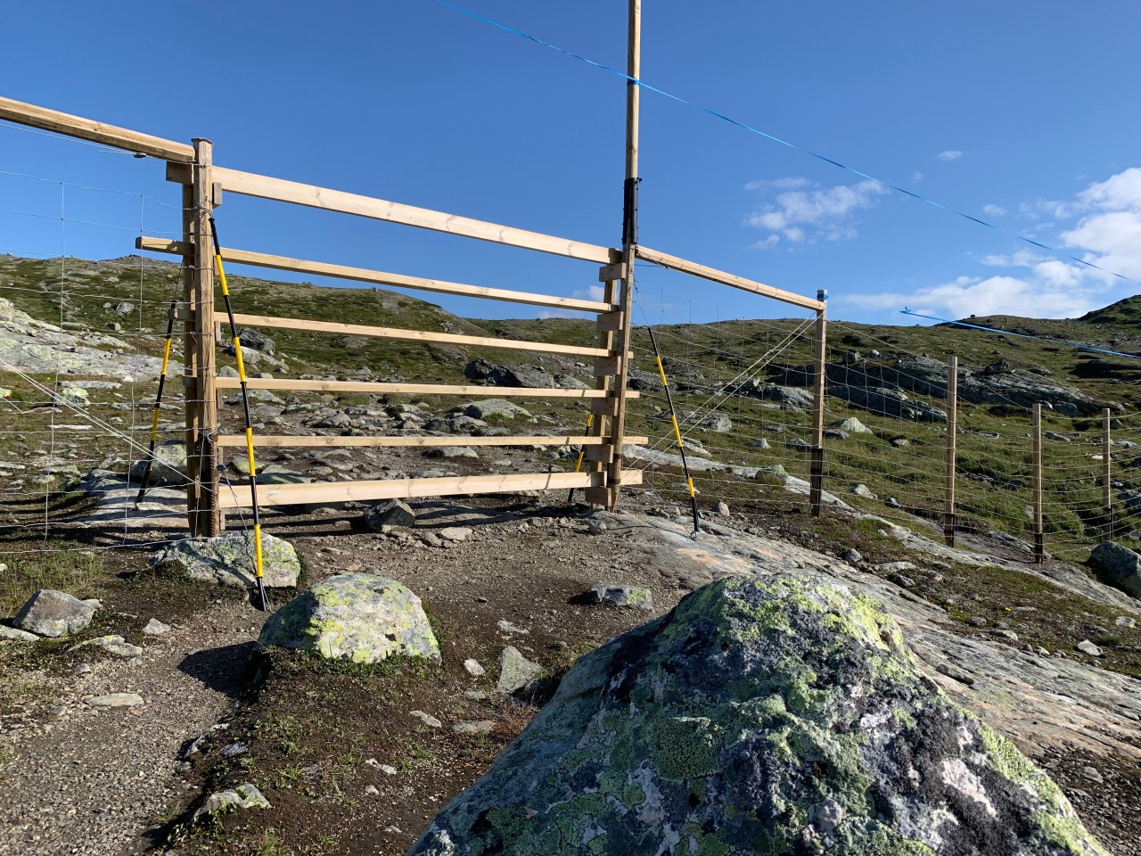 Elke ochtend is opstaan een verrassing, erg koud, beetje koud of beetje warm. De laatste twee vind ik prima. Gisteren een voor mij flinke afstand afgelegd, ik krijg dan van die restless knees in mijn mummyslurf. S’morgens voelt alles weer prima…..dacht ik…maar bij het eerste klimmetje voel ik mijn ongetrainde spieren meteen. En toch, in de loop van de dag gaat het dan weer goed. Vreemd iets hoor, een lijf. Ik had pijn aan mijn heup voor ik vertrok naar Wales, niks meer van gemerkt. Na Wales blessure aan mijn linkervoet onder de twee middelste tenen (kan niet, weet ik), voel ik hier niks meer van. Zo apart dat je er pijntjes gewoon uit kunt lopen. Ja, lopen heelt echt (niet alle wonden…maar een hoop). Het is nogal een grijs-groen blokkenlandschap vandaag, rommelig, al die losliggende brokken overal, ook best eentonig. Ik mis een beetje de hoge witte pieken. Ik loop en loop, kijk rond en rond, oke…moeilijk om mooie fotoos te maken. Ik betrap me er op dat ik me een beetje schaam voor die gedachte, loop ik hier potverdrie in mijn eentje te backpacken in Noorfuckingwegen…vind ik het saai. Dan maar een video van schaapjes die me kwamen bezoeken tijdens een verlaat ontbijtje. Video’s maken is superleuk, maar met slecht bereik niet te doen…uploaden duurt té lang. Ik vind het vandaag toch wel pittiger dan gisteren. Onderweg schiet me ineens de opmerking te binnen van de huteigenaar van de Geitterhutten waar ik mijn drankjes had, dat als ik de 22 km van hut naar hut te ver zou vinden ik ook tot de volgende kleine hut kon lopen, daar stopte een bus die je meteen naar de hut in Österbo reed, maar die kwam maar eens per dag om 13 uur. Neeeehjj, zei ik toen, ben jij gek, ik kom hier om te lopen. Ik keek op mijn horloge, 11.30…. oké…en ik zette de pas er in, geen foto’s meer. En hoe meer minuten er verstreken hoe meer ik díe bus wilde halen. Dat zou een megadip teweegbrengen nu als het niet zou lukken. Een uur te vroeg was ik er, de bus bleek nl 40 min later te komen. Alle tijd ineens voor een wc, droge sokken, geluchte voeten én een vers drankje.