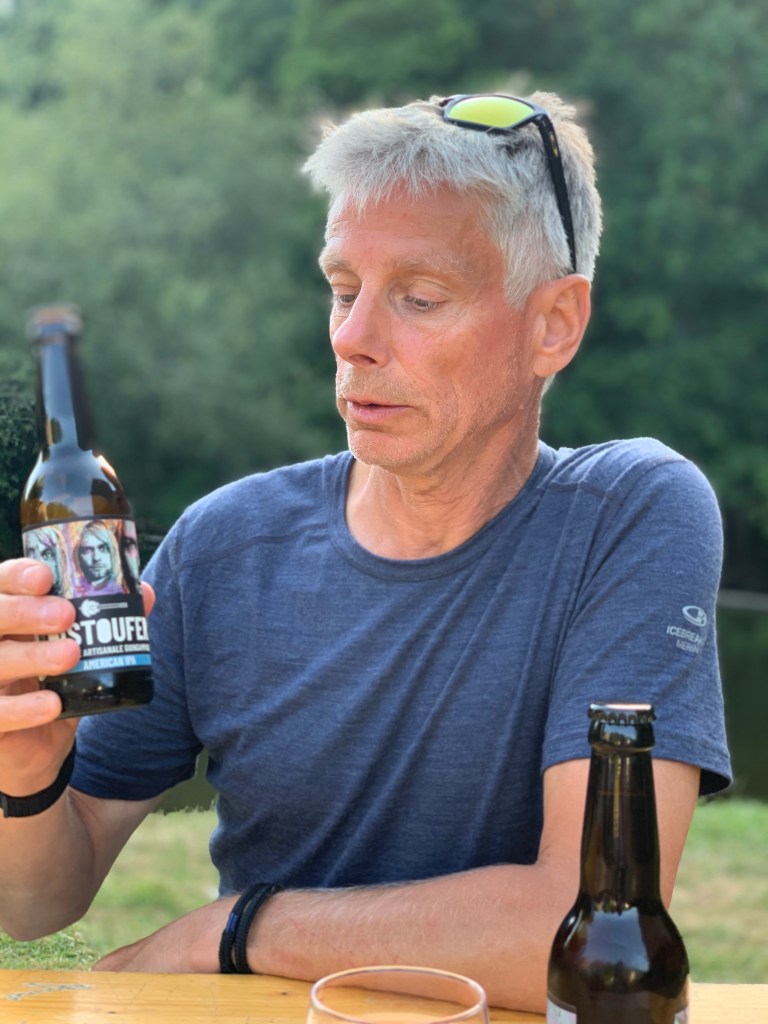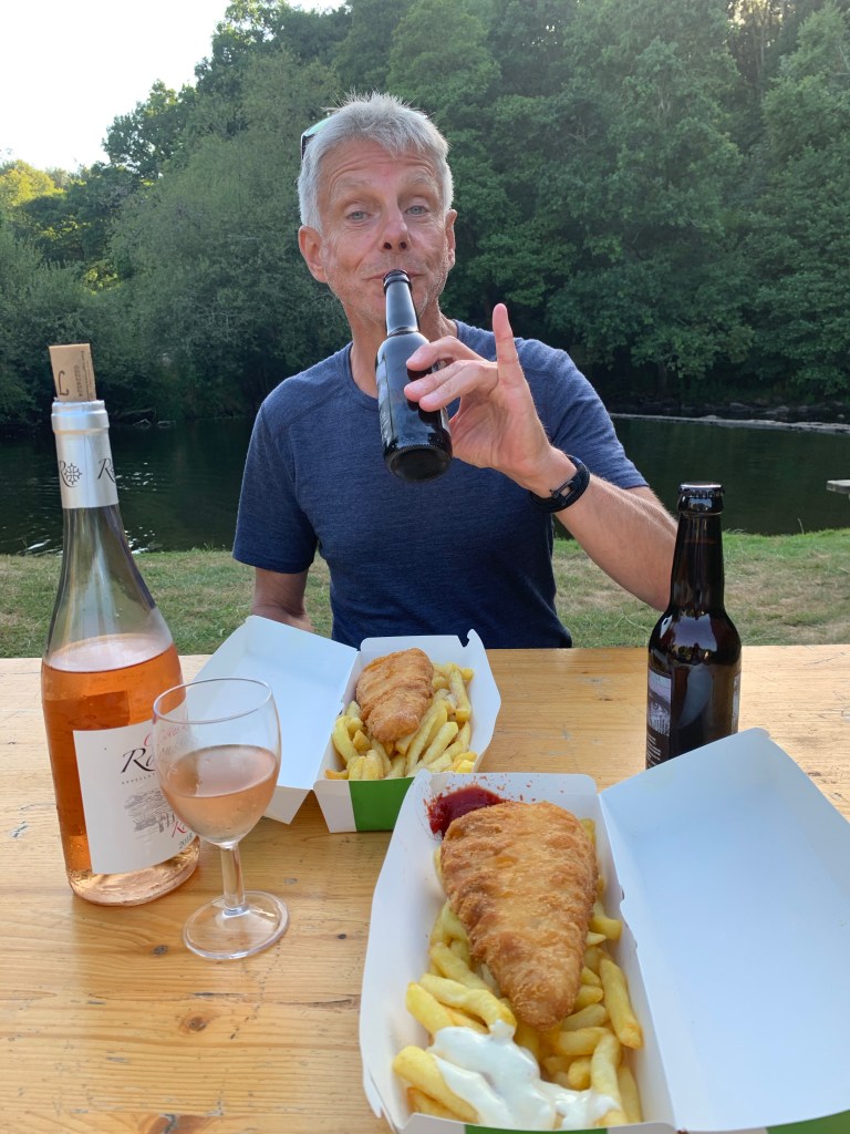 De camping wordt beheerd door een Engels stel en ze serveren precies op de twee avonden dat wij er zijn fish&chips uit hun foodtruck. Heel schattig ….maar de beste fish&chips die ik ooit had. We hebben voor het eerst een gesprekje met iemand anders dan met onszelf. Aan zo’n gezellige lange klaptafel aan het riviertje, toevallig ook een mixstel Nl-En. (Hij praat alleen wél Nederlands haha….wat overigens totaal geen indruk maakt op Paul of wat dan ook in werking zet). Even het relaxte knusse campingleven ervaren. Er komt nog net geen gitaar en samen zingen aan te pas. Maar wel een kampvuurtje. Bij onze eigen vuurplaats sluiten we de dag af… starend in het vuur met nog een restje lauwe rosé.