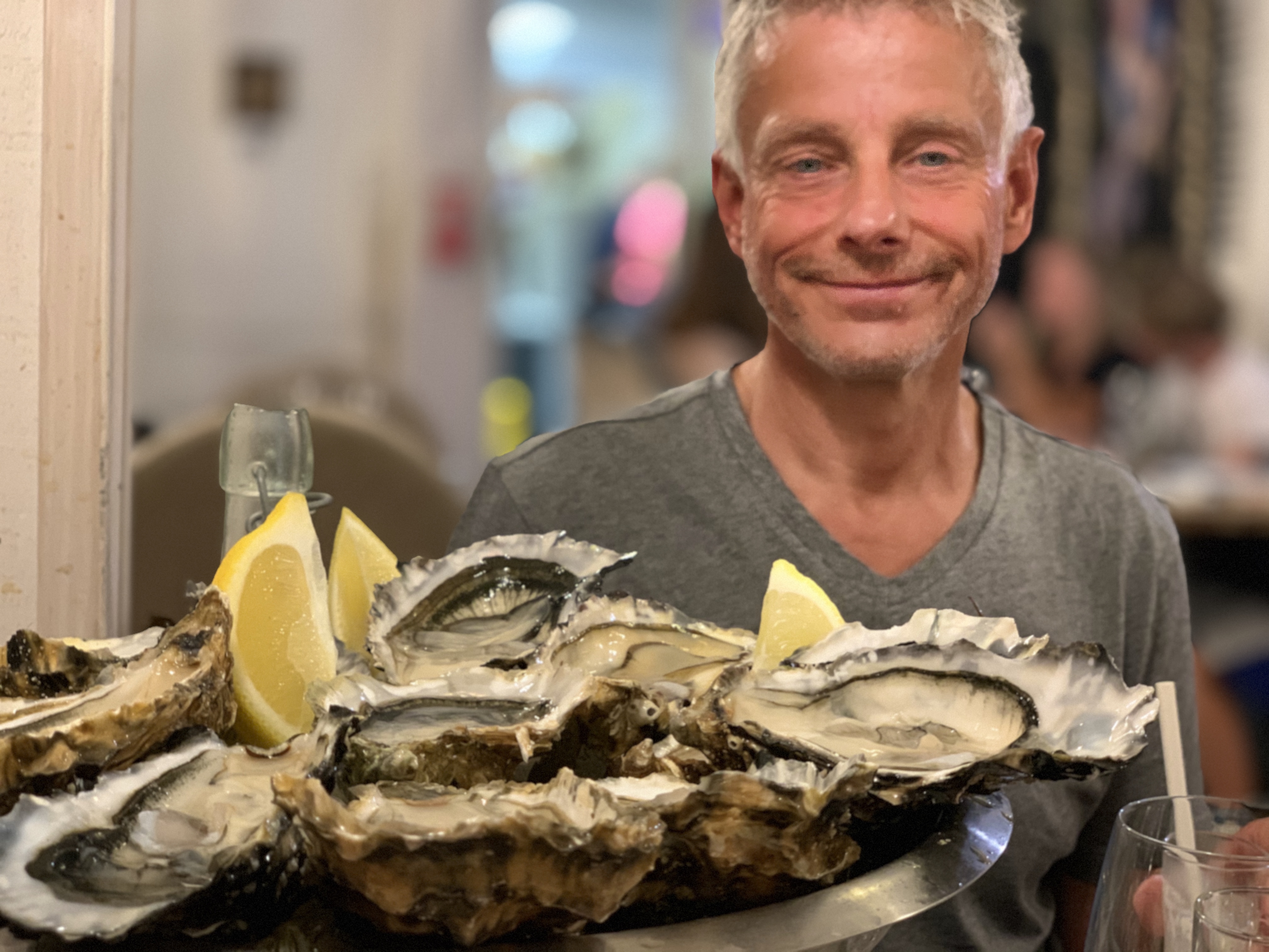 We liepen het kleine mooi aangelegen dorpsstraatje in en kregen gelukkig een tafeltje in het op Foursquare (app van Paul) aanbevolen restaurantje. Das wat anders dan droogvoer uit een foliezak. Dikke vette oesters, echt een mondvol vlezig sappig zeevoedsel….Ik hoef ze nu even niet meer hier in Eindhoven te bestellen, deze ervaring moet eerst slinken. We hebben waardig afscheid genomen van de Franse westkust. In de avonduurtjes nog op de boulavard rondgehangen en toen ons nestje opgezocht. Nog nooit eerder een hoekkamer gehad met ramen haaks op elkaar, naar twee kanten uitzicht. Met een heerlijk koel zeewindje door de kamer was het zalig slapen.