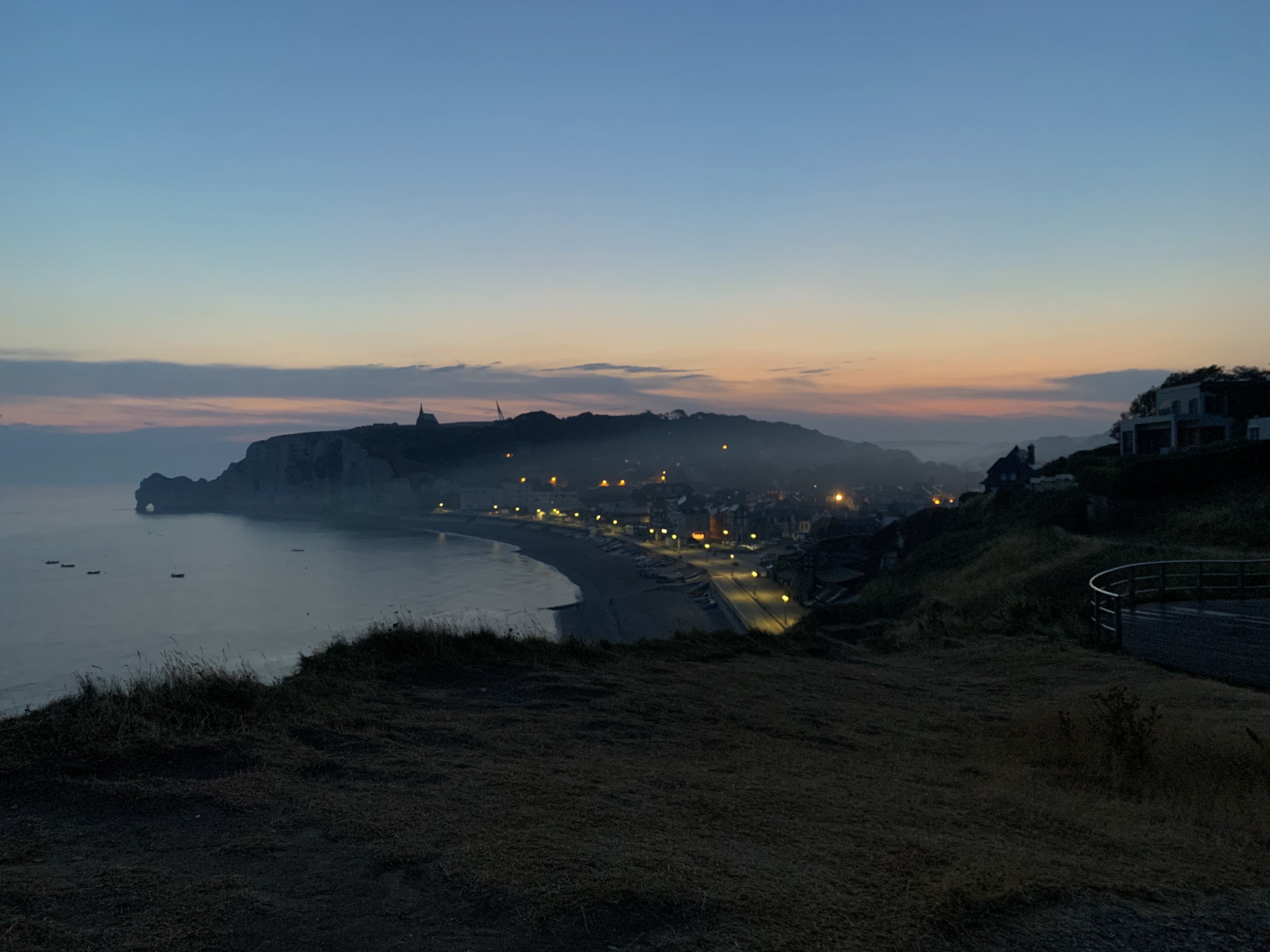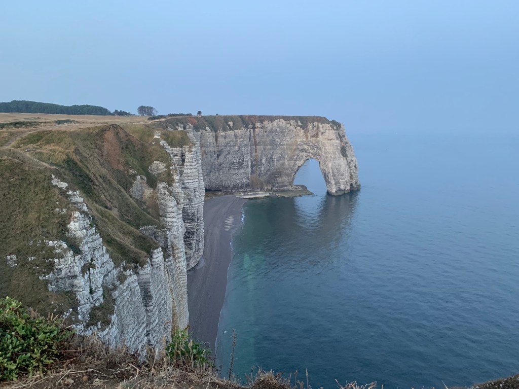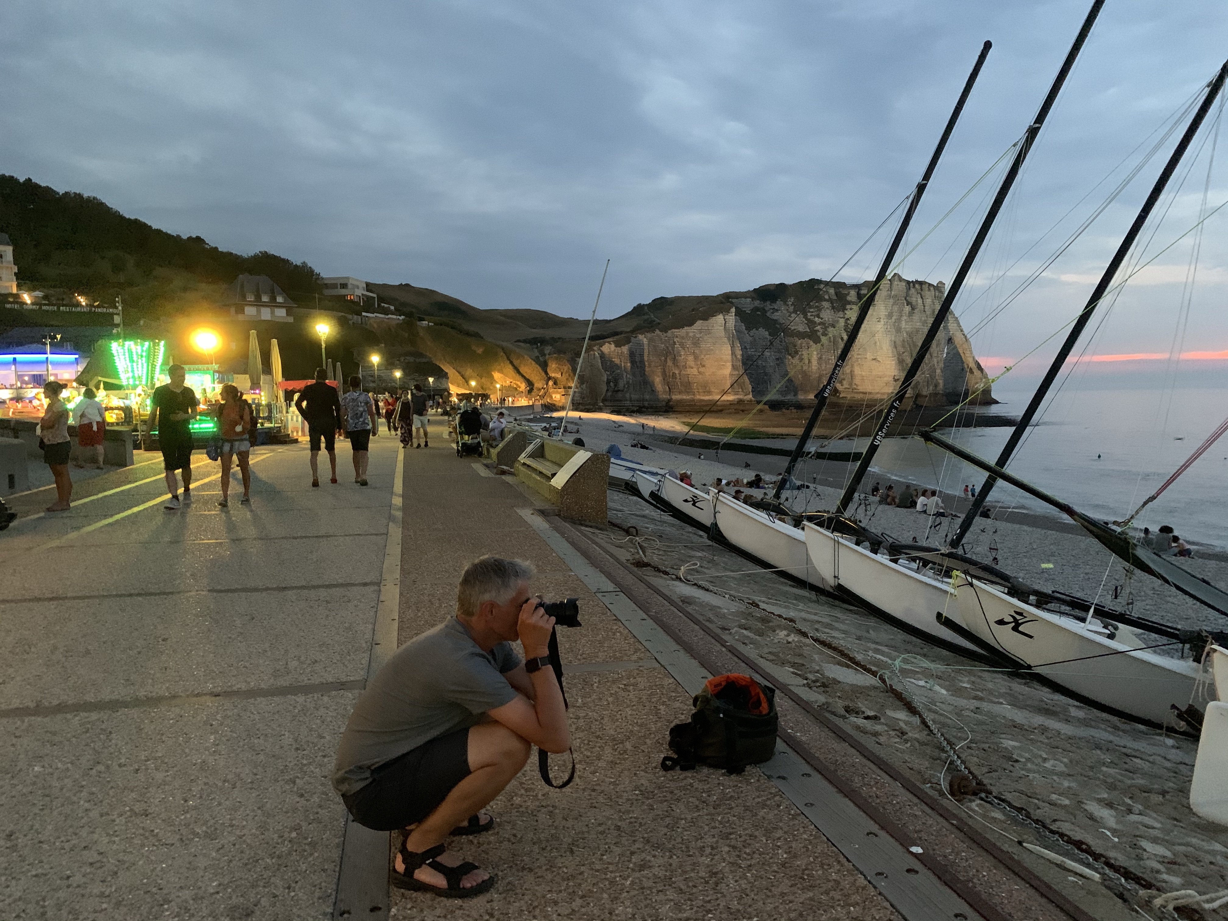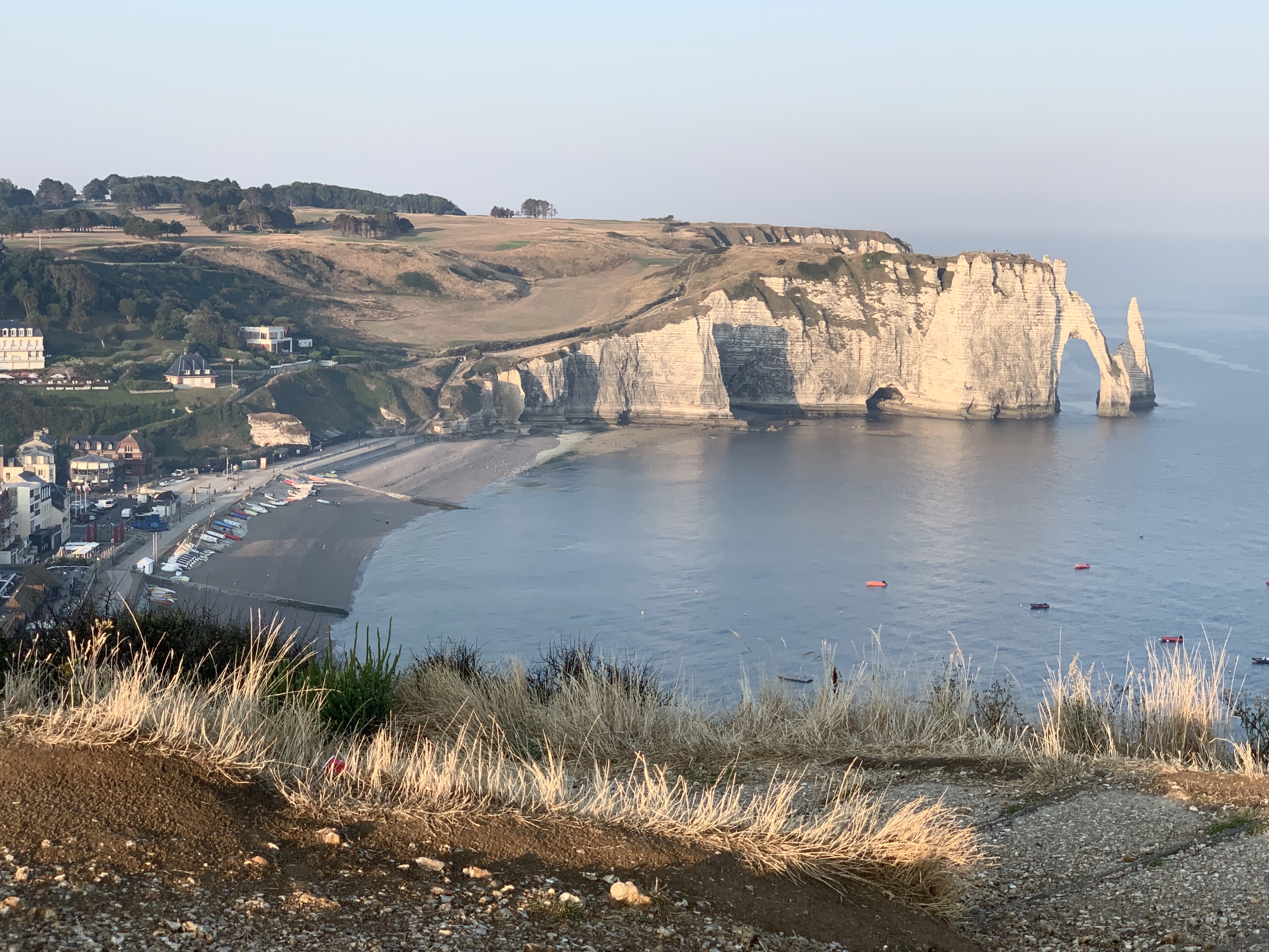 We wilden een tussenstop op de weg van Bretagne naar Calais. In Calais zouden we de Eurotreintunnel nemen om in Wales familiebezoekjes af te leggen. In de UK hadden we dus ook nog een hele rit voor de boeg. Ik had in de vroege ochtend tijdens het tikken van de regen op ons tentdakje het plan opgevat om vervroegd Bretagne te verlaten en de lange reisdag in tweeën te hakken. Een beetje surfen op het web had me naar dit plaatsje gebracht aan de kust, Étretat. Hier zou de zon nog twee dagen schijnen. De aankomst na toch nog een uurtje of 4 rijden was spannend…érg drukke toegangsweg naar de kust…lange rijen auto’s aan beide zijden van de weg in de berm geparkeerd. Families slepend met zee- en strandspul én kinderen natuurlijk richting waar wij ons hotel hadden. Lange oprit naar een zeker Chateau…. ook weer helemaal vol geparkeerd tot aan de ingang van onze bestemming. Nog een paar u-bochten omhoog en hopsa, ineens een privé parking. Wat een opluchting. Met geen mogelijkheid had ik dat hele eind omhoog met mijn koffer willen slepen. Erg hoog golfbroeken- en bijbehorende golfgezichtengehalte in en rondom het hotel, want gelegen aan een golfbaan, maar daar liet ik me niet door van de wijs brengen. Wij hadden de laatst beschikbare kamer in dit toch wel prachtig gelegen hotelletje gekregen en we gingen het er van nemen!
