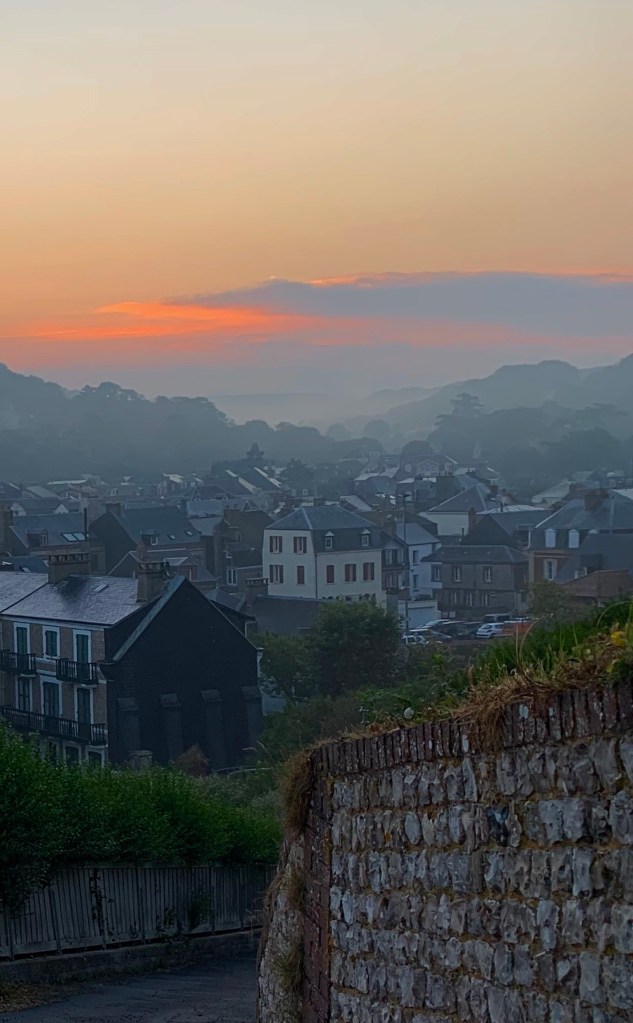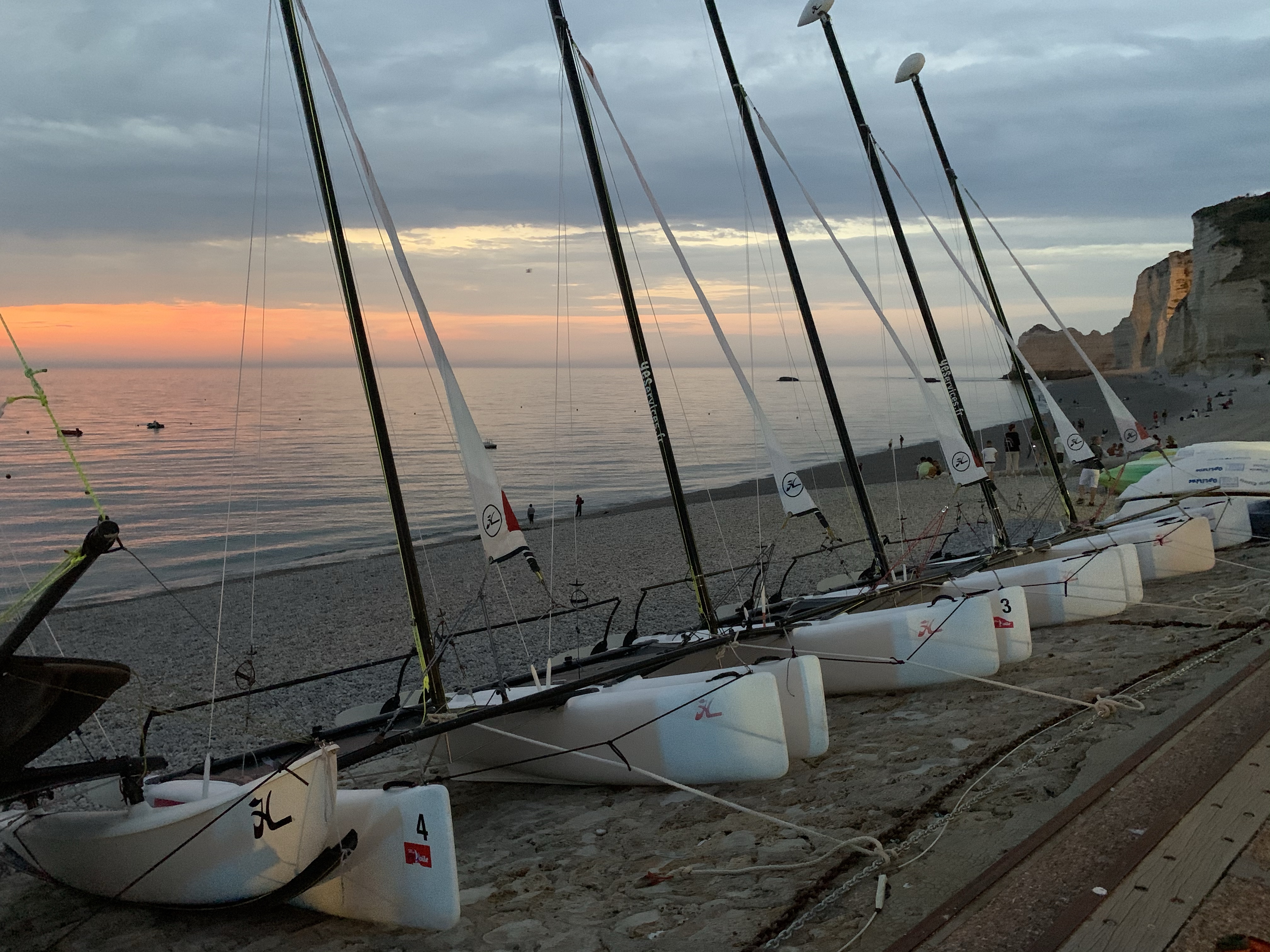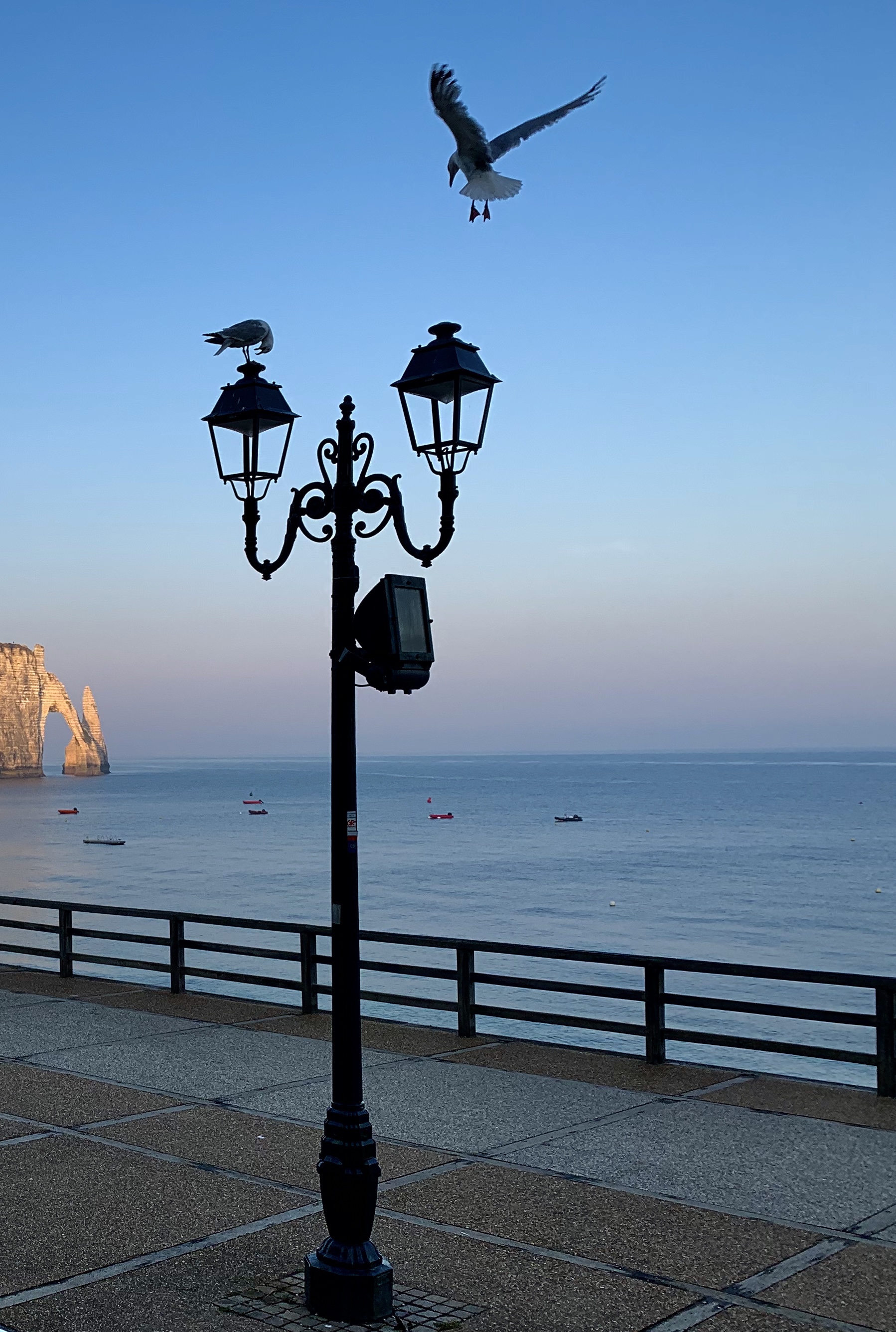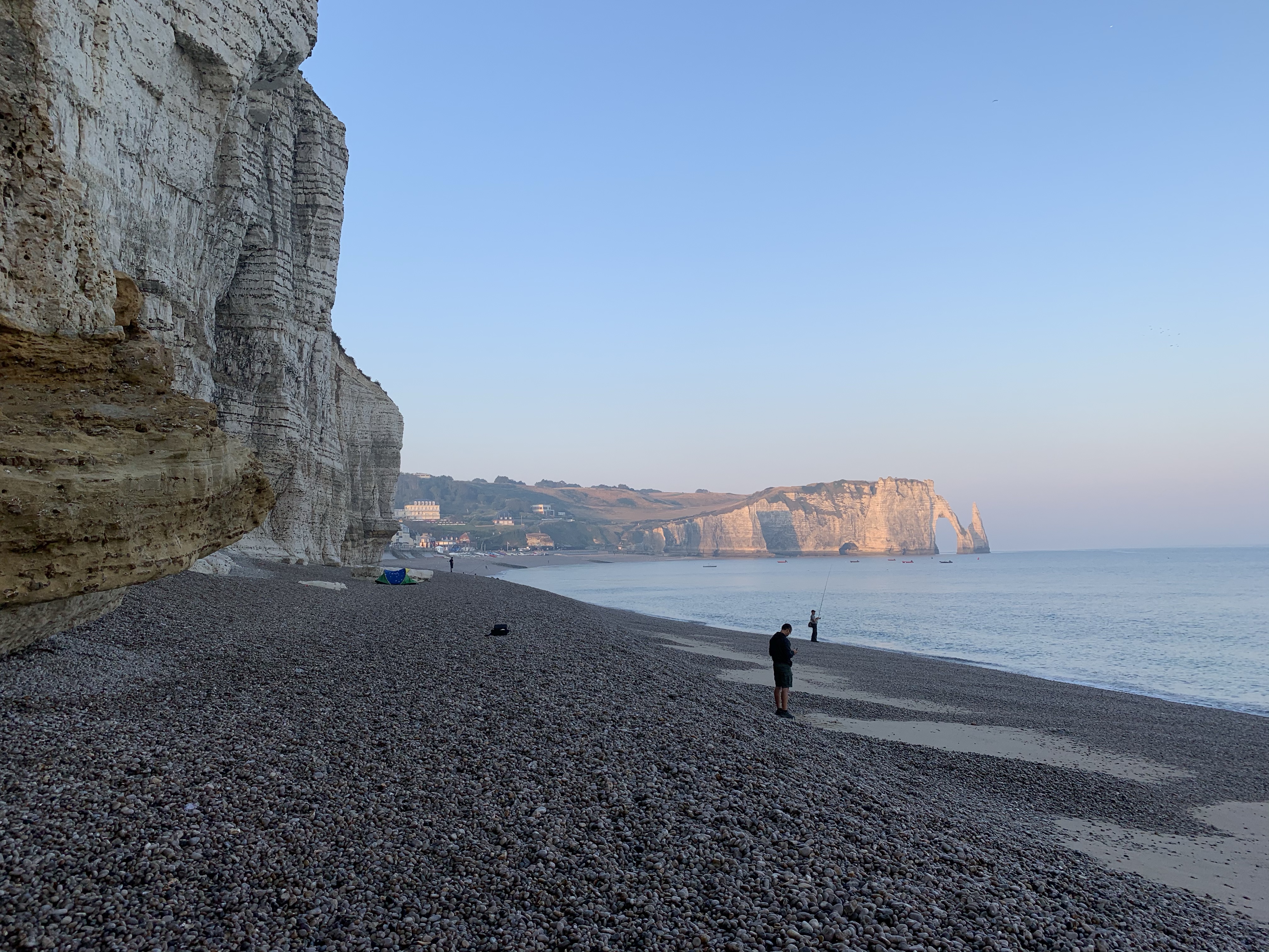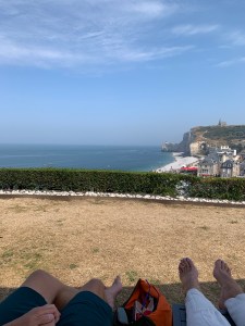 Het bleek een strandje tussen hoge kliffen gelegen met een bewaard gebleven kapel op de top wat een toeristische trekpleister bleek te zijn. Je zag een lint van mensen omhoog lopen als mieren naar hun nest. Heel geruststellend om dat vanuit de andere kant op de top te kunnen aanschouwen, liggend in een strandstoel met parasol en een gin-tonic naast je. Weer heerlijk liggen lezen tot het tijd werd om af te dalen naar het gepeupel haha. Nog steeds best druk op het boulevardje en het keienstrand. Waarschuwingsborden (alleen in het Frans) dat het verboden was de keitjes (pebbles in het Engels…maar wat is het woord in het Nederlands…..ohja, kiezelstenen) mee te nemen. Dat komt zo’n beetje op hetzelfde neer als dat er op ons Noordzeestrand zou staan “Verboden zand mee te nemen van het strand”……