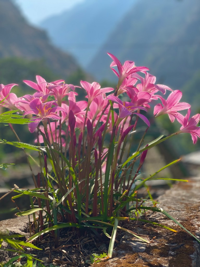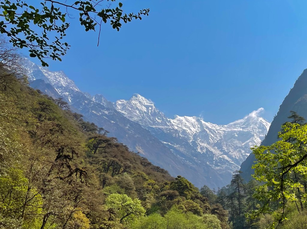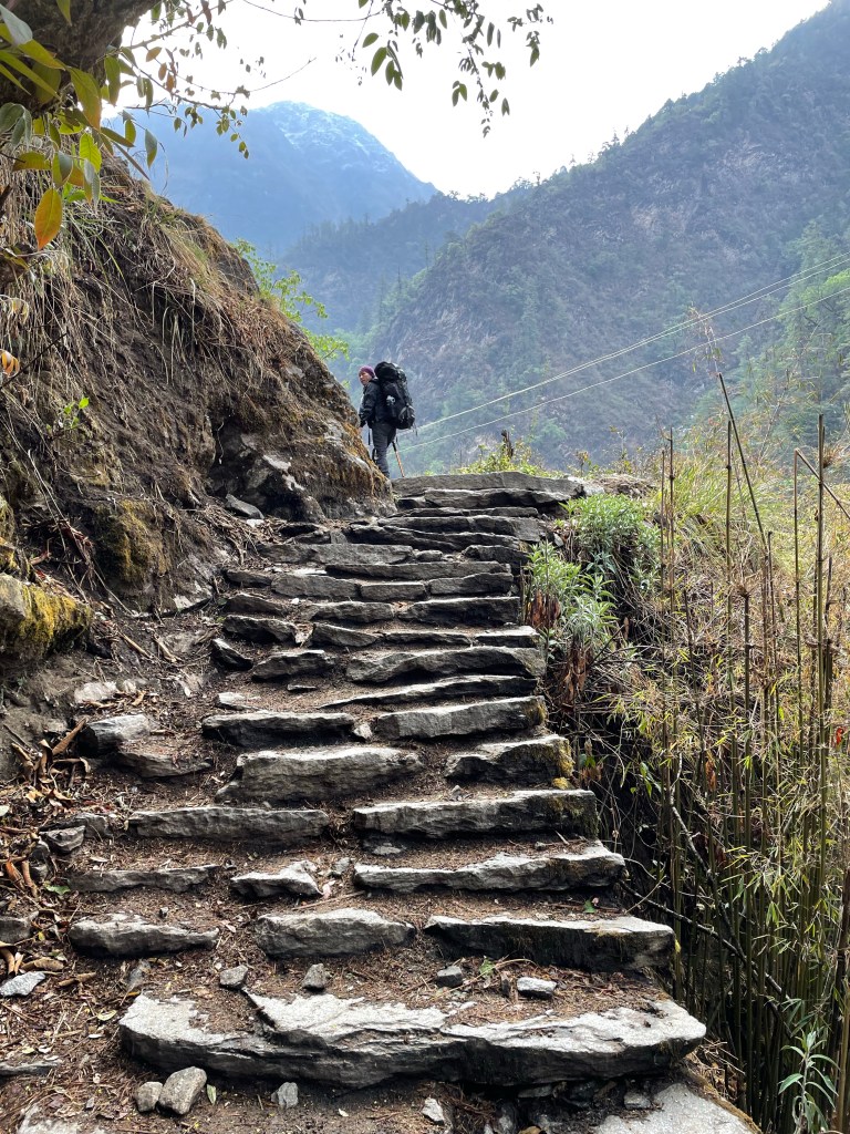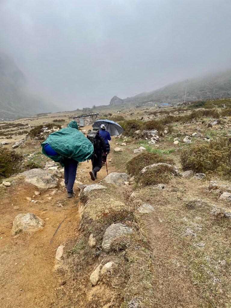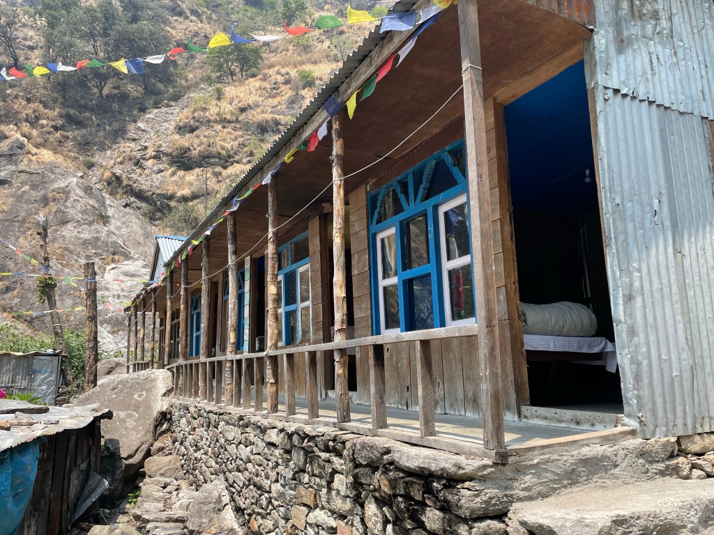 Dezelfde dag 4 lopen we s’middags terug naar Langtang Valley. De eerste regenbui overvalt ons hier. Bek- en bek af arriveren we in de bijna verlaten lodge om dag 5 uitgerust maar met méga spierpijn in bovenbenen terug naar Rimche te lopen. Het kost me nog drie hikedagen voor die pijn eruit is. Dag 6 is een lange afdaling terug naar startpunt. Ik merk dag 5 pas op dat er in ons reisschema 31 april opgenonen is…uhhh… Raj…. shit…hoe gaan we dat oplossen. Met de kaart erbij komen Paul en ik tot het besluit dat we ons plan moeten omgooien. Geen verdere uitputtende klimmen en afdalingen, maar een nieuwe andere kant op, richting Tibet…. klinkt fijn. Toch komen we nog wel drie keer op dit besluit terug omdat het toch een beetje als een “loser” optie voelt. Maar als we (gelukkig allebei) eerlijk zijn, put het ons behoorlijk uit die hele dag lopen met die hoogteverschillen en kijken we ook uit naar een iets minder hoogdravend plan. Naast het super genieten en ál die ongelooflijke indrukken die we opdoen van het leven hier in het berggebied, is het ook best afzien. Waar we thuis of elders in Europa na een uitputtende wandeldag in een hete douche of bad stappen en in een lekkere tuinstoel bijkomen met een wijntje, is het hier in de ijzige kou bibberend hoopvol in een Nepalees wc-hok onder een soort van douchekop te staan die dan helaas toch alleen ijskoud water geeft…waarna je met je afgezwete plakkende zonnebrand armen en benen weer terugstapt in je stinkbroek en stijve riekende sokken. Koud douchen heeft grenzen! En die douchekop is er alleen in de meest luxe lodge haha. Dat zijn overigens de ergste situaties, de rest valt allemaal reuze mee. We kunnen ons aan alle Nepalese gewoontes best goed aanpassen, all part of the fun. Het eten vind ik héérlijk! Elke avond zitten we happy en tevree aan de Dalbaat met medewandelaars en kruipen meteen daarna onze slaapzak in. We slapen als rozen, soms moeten de oordoppen in maar meestal zijn we te moe om ook maar ergens last van te hebben. Mijn benen herstellen zich wonderbaarlijk in horizontale stand en de Langtang Trail sluiten we na 6 dagen af, terug in Syabrubesi. Morgen start de voor ons vierdaagse Lamtang Heritage trail.