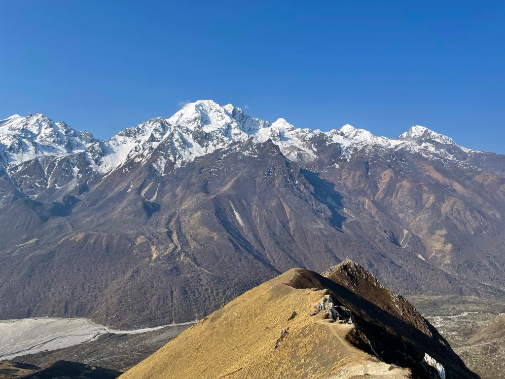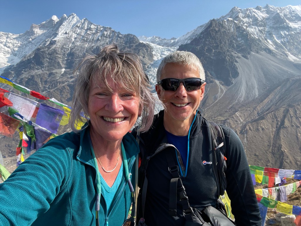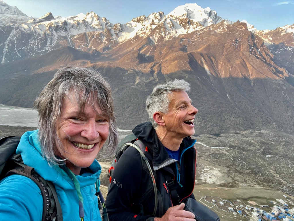 Dag 2 en 3 brengen ons via Lama Hotel en lodge Langtang Valley naar de hoogst gelegen lodge Kiyanji Gompa op 3800m. hoogte. De volgende ochtend dag 4 vertrekken we om 5:30 uur zonder gewicht op de rug, naar onze top. Er zijn hier verschillende opties, ook tot boven de 5000m, wij gaan voor 4600m. De opwinding en adrenaline stuwen ons omhoog, natuurlijk hijgen we daarbij als een afgeschreven stel wandelaars. Maar bovenaan zijn we happy …en ook stil. Genietend nemen we onze privé momentjes…lekker met je eigen gedachtes in de verte staren. We zijn daar met zeven mensen en als ik een stukje verder loop ben ik gewoon alleen. Dit was de reden om voor Langtang te kiezen en niet Annapurna of Mount Everest BC…de foto’s die ik zag van de top daar met honderden anderen, schrokken mij af. Het is een verrassend windstille en warme ochtend op deze hoogte. Van de uitzichten krijgen we geen genoeg. In twee uur dalen we aan de andere kant van de berg af en ik dank alle Boedhistische goden op mijn blote knietjes dat ze het volhouden.