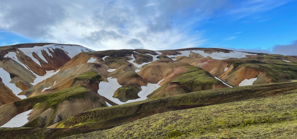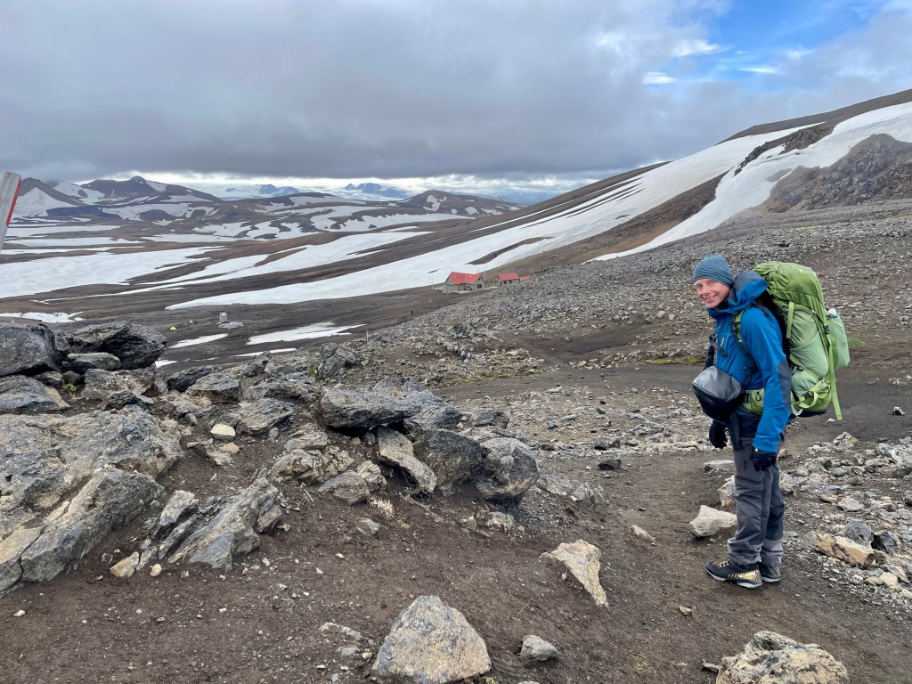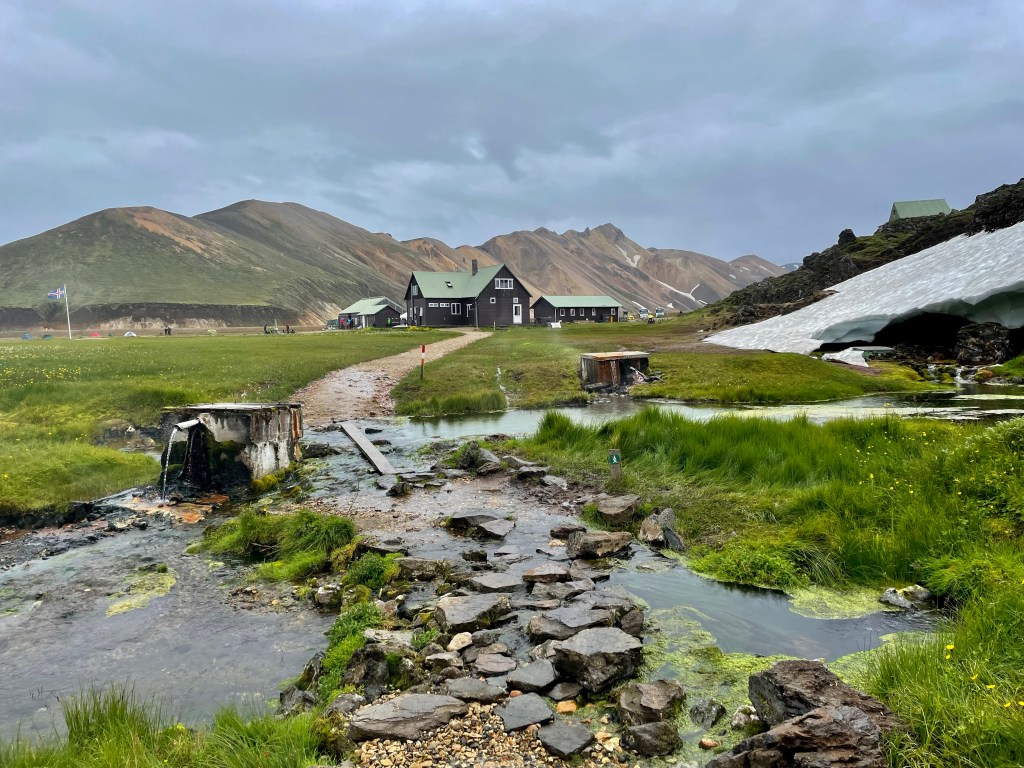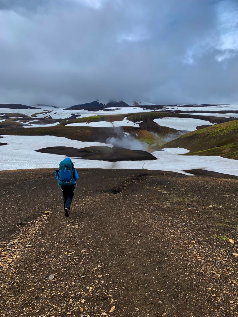 We hebben een 3 uur durende bustocht van Reykjavik naar startpunt van de Laugavegurtrail, we arriveren al om 10:30 uur in Landmannalaugar. Het is guur en koud weer, het regent nog steeds. Echt geen fijne start zo. Sommige mensen lopen meteen weg vanuit hier voor hun eerste traildag, ik ben heel blij dat wij hier een nachtje blijven, ik moet me echt mentaal even voorbereiden. Om 12 uur gaat de hut open en ik zoek een fijn plekje uit voor ons, bij een raam en in een hoek, ietsje privacy proberen te creëren. We wandelen een beetje in de omgeving en genieten van de laatste rugzakloze meters . Ik heb geen badpak meegenomen, maar heb ook helemaal geen zin om in de hete bronnen te dompelen en daarna met mijn mini handdoekje in de ijzige wind de 100 m terug te lopen. Als ik s’nachts moet plassen (aankleden, hut uitsluipen en naar toilethok lopen) loop ik in alle rust naar de bronnen waar de stoom in wolken vanaf komt. Ik geniet van de zonsopkomst en kruip weer terug in mijn slaapzak.