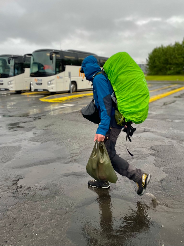 Het is pisweer in Reykjavik. Door de regen sjokken we naar ons hotel met teveel kilos. We laten de kleine rugzakken hier achter, die pikken we na de trail weer op. Moeilijk besluit om ook mijn camera achter te laten, maar ik moet aan mijn knieën denken. Wel draag ik dan het statief en filtersysteem. Zo kom ik uit op 17,5 kg en Paul op 20. Ik zie best op tegen de trip, de rugzak voelt als 40kg, en de regen maakt het niet beter. We gaan nog wel even uit eten in Reykjavik. Ik zet me over de ongelooflijke prijzen hier heen, ga niet de hele tijd hierover klagen, dat bederft Pauls humeur, we genieten van een laatste glas wijn van €12,50.