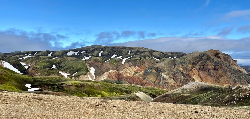 Do 28 juli om 8 uur gaan we op pad. Expedition breakfast achter de kiezen én het is droog! Einddoel is Hrafntinnusker, 950m klimmen over 12 km. Ik heb ontelbaar veel indrukwekkende plaatjes alleen al vanndeze eerste wandeldag. Het ene prachtige uitzicht na het andere. Het weer is er niet naar om uitgebreid te lunchen onderweg, toch maken we snel een noodlesoepje bij een flinke geizer, die stoot ook warme zwavellucht uit waar ik mijn handen een beetje aan warm. Het liefst zou ik er helemaal in gaan staan, maar het is natuurlijk stoom, dus wordt je er nat van. En we zijn juist zo blij met het prachtige droge weer.