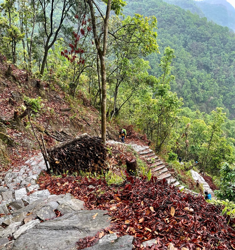 Ik word per taxi afgezet aan de voet van stenen trap in de zeikende regen die de hele dag niet meer zou stoppen. Slechts 11,5 kg op mijn rug, maar dat voel je toch wel trap op. Er kwam geen einde aan. Ik passeer dorpjes, heel af en toe een wandelaar, maar het is vooral uitgestorven. Ik geniet terwijl ik doorweekt raak. Ik ben op pad, op avontuur, alleen, eigen tempo…heerlijk!