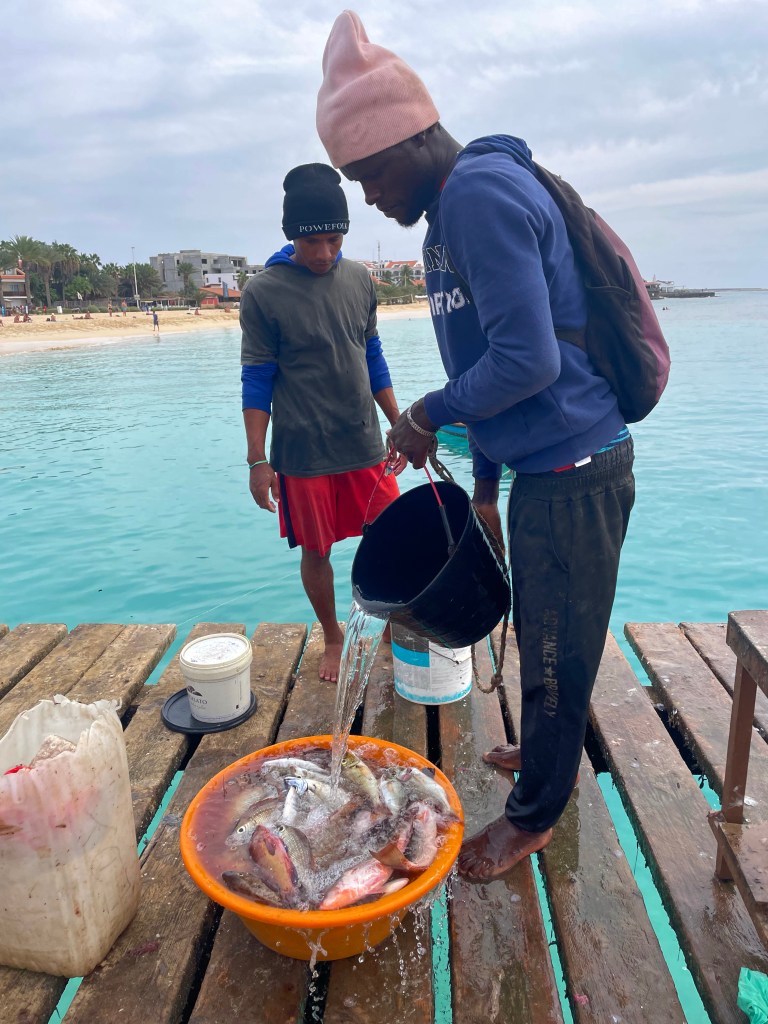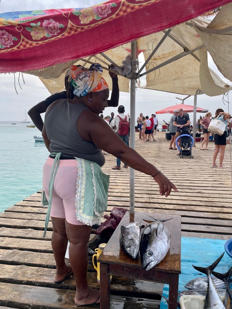 De tweede dag meteen met de taxi naar Santa Maria, the place to be. Ik trap meteen in de eerste de beste verkooptruk van een Kaapverdiaan en sta na 10 minuten buiten het winkeltje, €30 armer met een lappetas, nog een jurkelap en een schilderijtje van lap. Paul verklaart me voor gek. Voor het kindertehuis, alleen vandaag open, ik herkende jullie uit het resort etc etc Ik geloofde hem echt! Ben eerst boos op Paul omdat zo wantrouwig is en daarna daalt er ook over mij een nuchterheid. Oké! Dat was de eerste donatie aan het eiland. Caro op reis. We wandelen langs strand, doen de pier aan. Zien allerlei vissen met vliegen verhandeld worden, koppen afgehakt worden, ingewanden rondslingeren en ander verkoopbaar goed uitgestald. We zoeken terug een lunchplek waar het gevangen waar tot iets eetbaars is gemaakt.