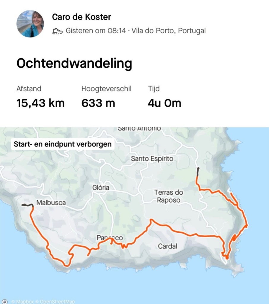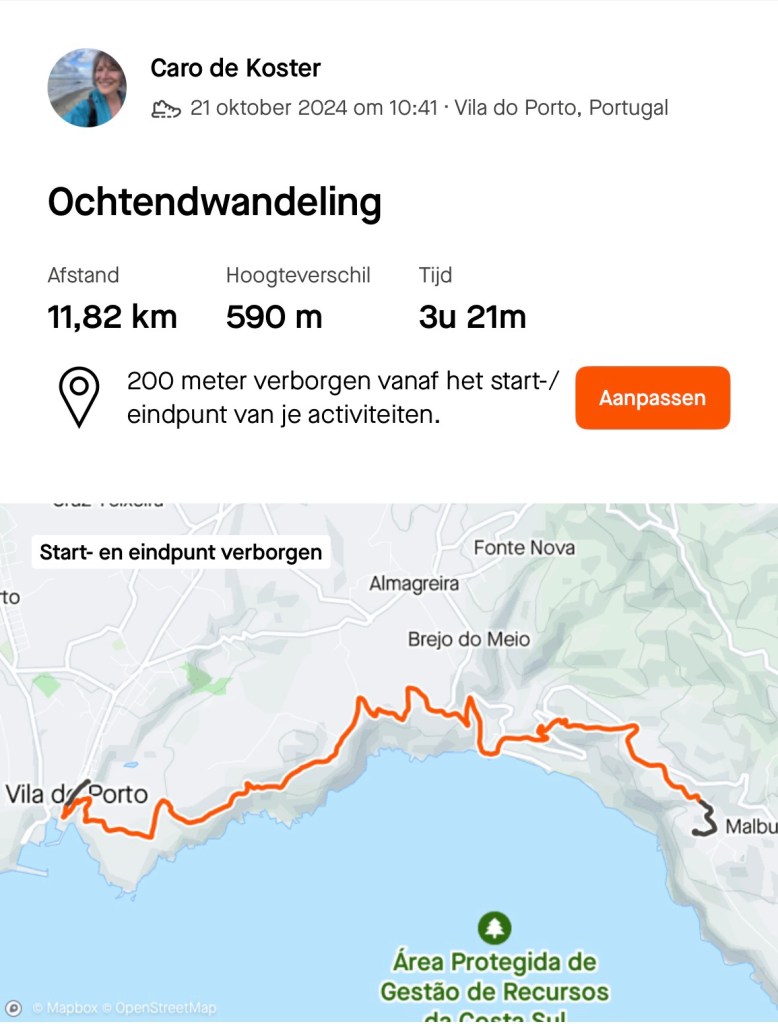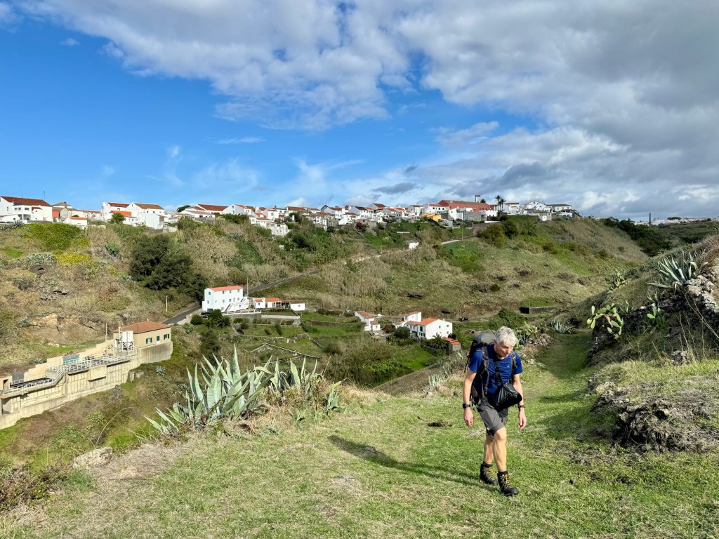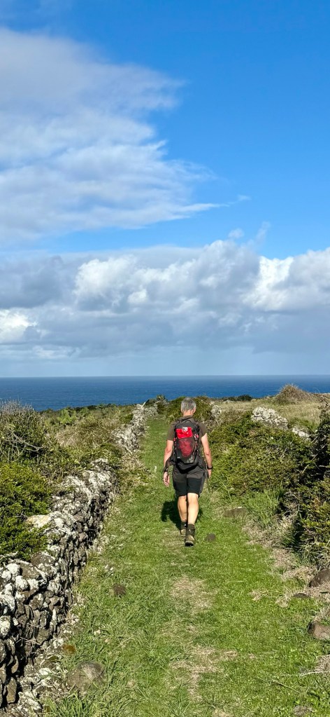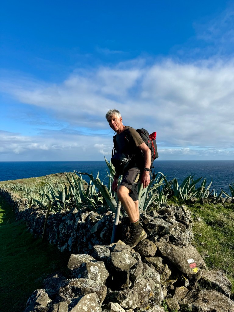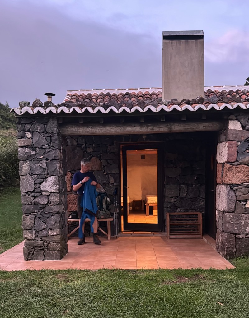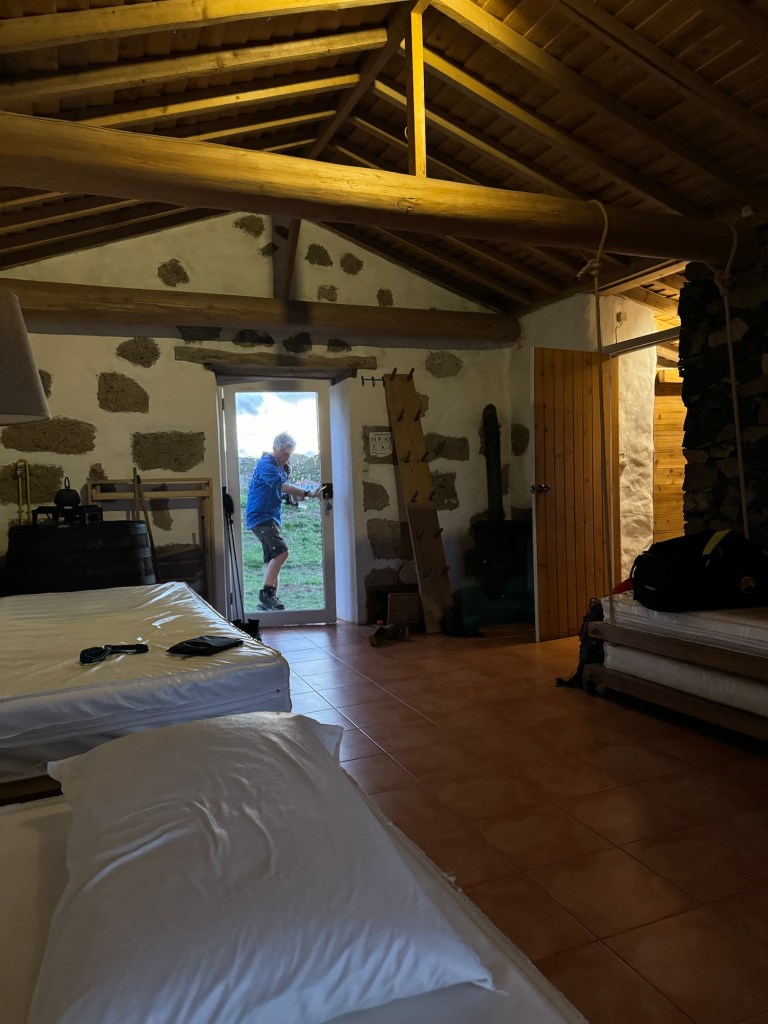 Op het rondje van ongeveer 80 km dat wij lopen op dit eiland hebben we in Santa Barbara één klein (leeg) terrasje geopend gezien. Het is onvoorstelbaar dat het hier op een ander tijdstip druk zou zijn. Toch oogt het vaak geciviliseerd, veel lege zomeronderkomens van de rijkere Portugezen wellicht, verstrooid over het hele eiland. Tegelijkertijd ook héél veel onbewoonde krotten, bouwvallen en ruïnes. Het landschap waar je over uitkijkt lijkt “bewerkt”, overal groen gras met muurtjes alsof alles is opgedeeld in kavels en óveral koeien met hun kalveren. We lopen door heel afwisselende omgevingen, bamboebossen, grasvelden, strandboulevards, door rivierbeddingen…..bospaden….heel veel heuvels op en af…allemaal niet eng, heel relaxed lopen en supergoed aangegeven. Ik vind het achter elkaar door lopen zonder hoeven nadenken waarheen fijn, dit zou ik nog wel langer willen doen.