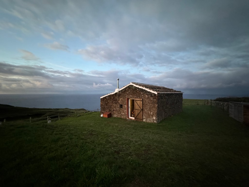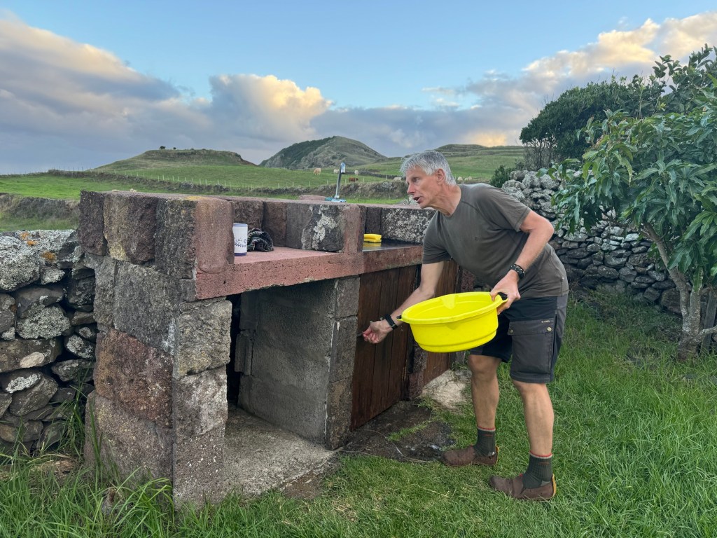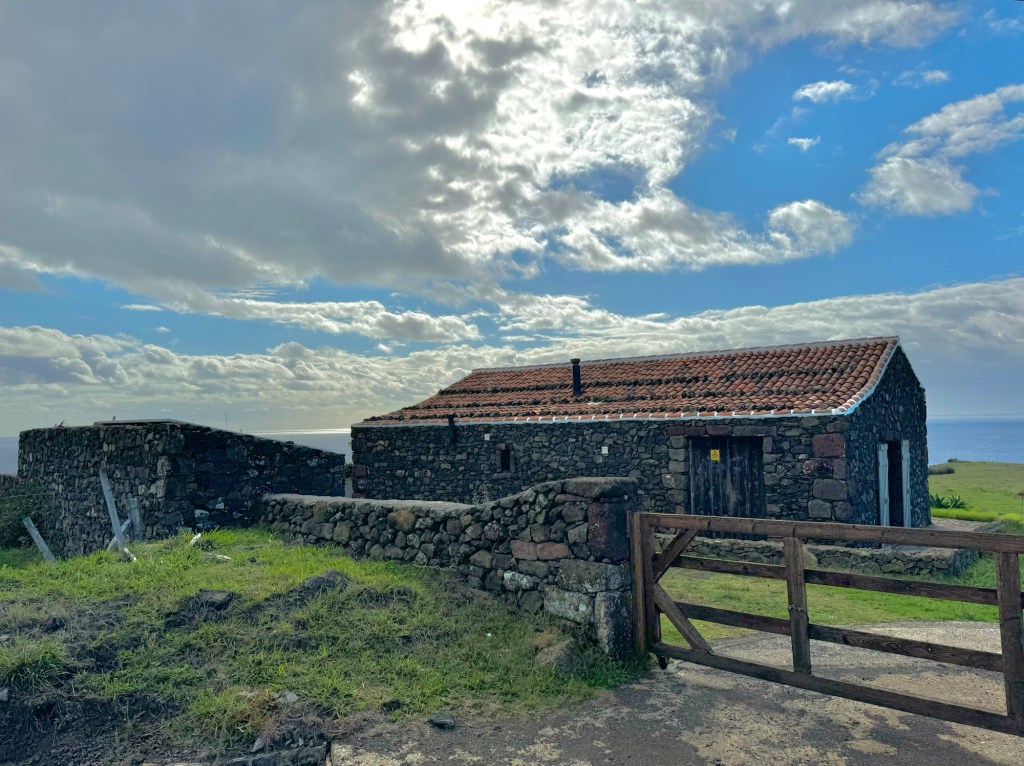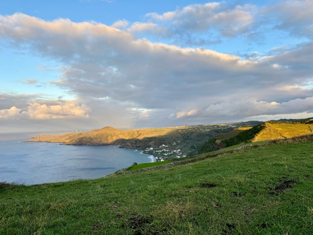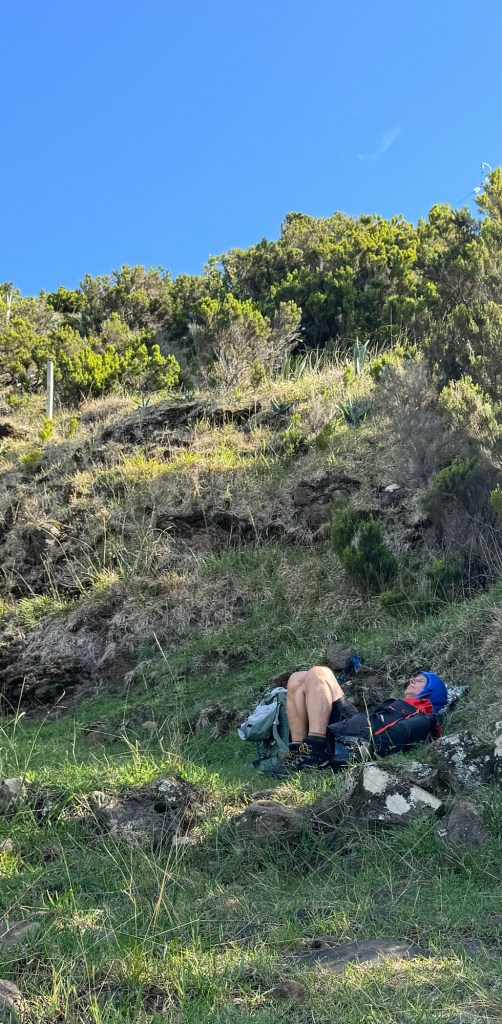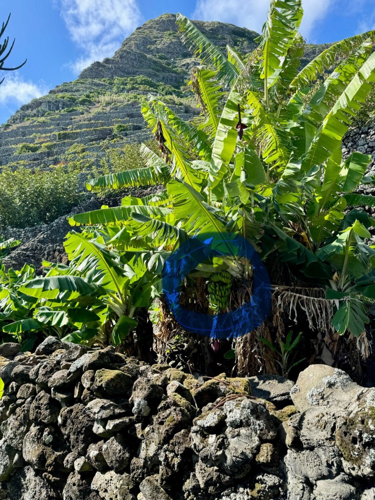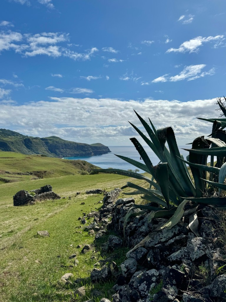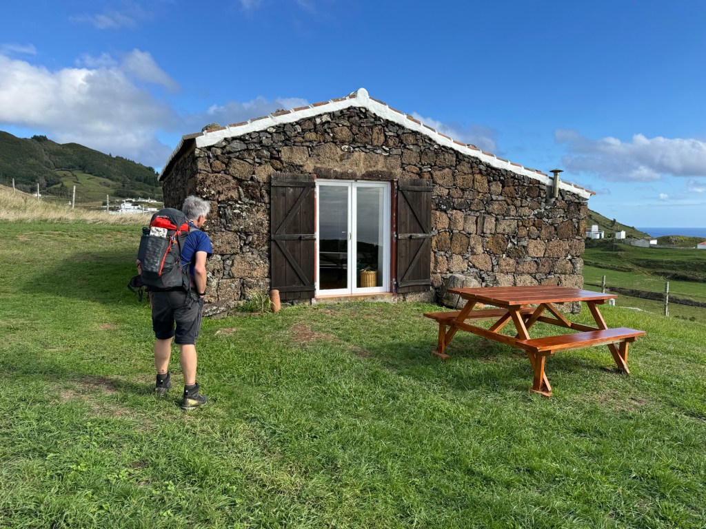 Op het rondje van ongeveer 80 km dat wij lopen op dit eiland hebben we in Santa Barbara één klein (leeg) terrasje geopend gezien. Het is onvoorstelbaar dat het hier op een ander tijdstip druk zou zijn. Toch oogt het vaak geciviliseerd, veel lege zomeronderkomens van de rijkere Portugezen wellicht, verstrooid over het hele eiland. Tegelijkertijd ook héél veel onbewoonde krotten, bouwvallen en ruïnes. Het landschap waar je over uitkijkt lijkt “bewerkt”, overal groen gras met muurtjes alsof alles is opgedeeld in kavels en óveral koeien met hun kalveren. We lopen door heel afwisselende omgevingen, bamboebossen, grasvelden, strandboulevards, door rivierbeddingen…..bospaden….heel veel heuvels op en af…allemaal niet eng, heel relaxed lopen en supergoed aangegeven. Ik vind het achter elkaar door lopen zonder hoeven nadenken waarheen fijn, dit zou ik nog wel langer willen doen.
