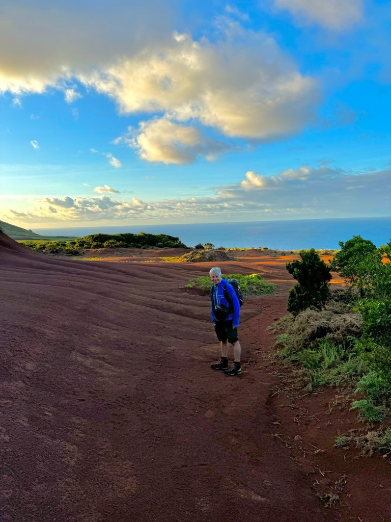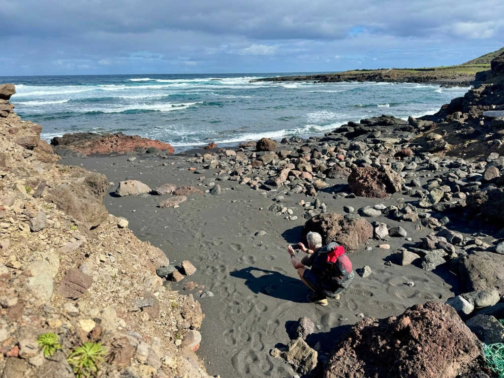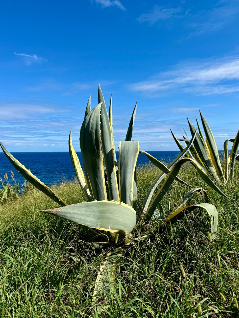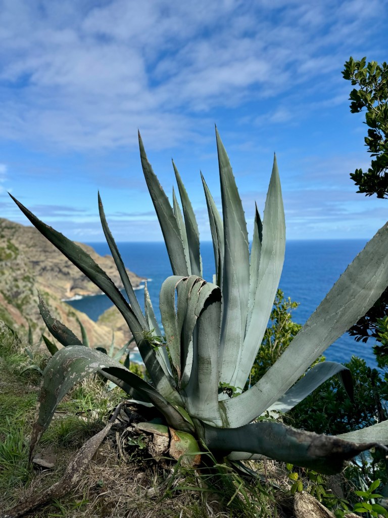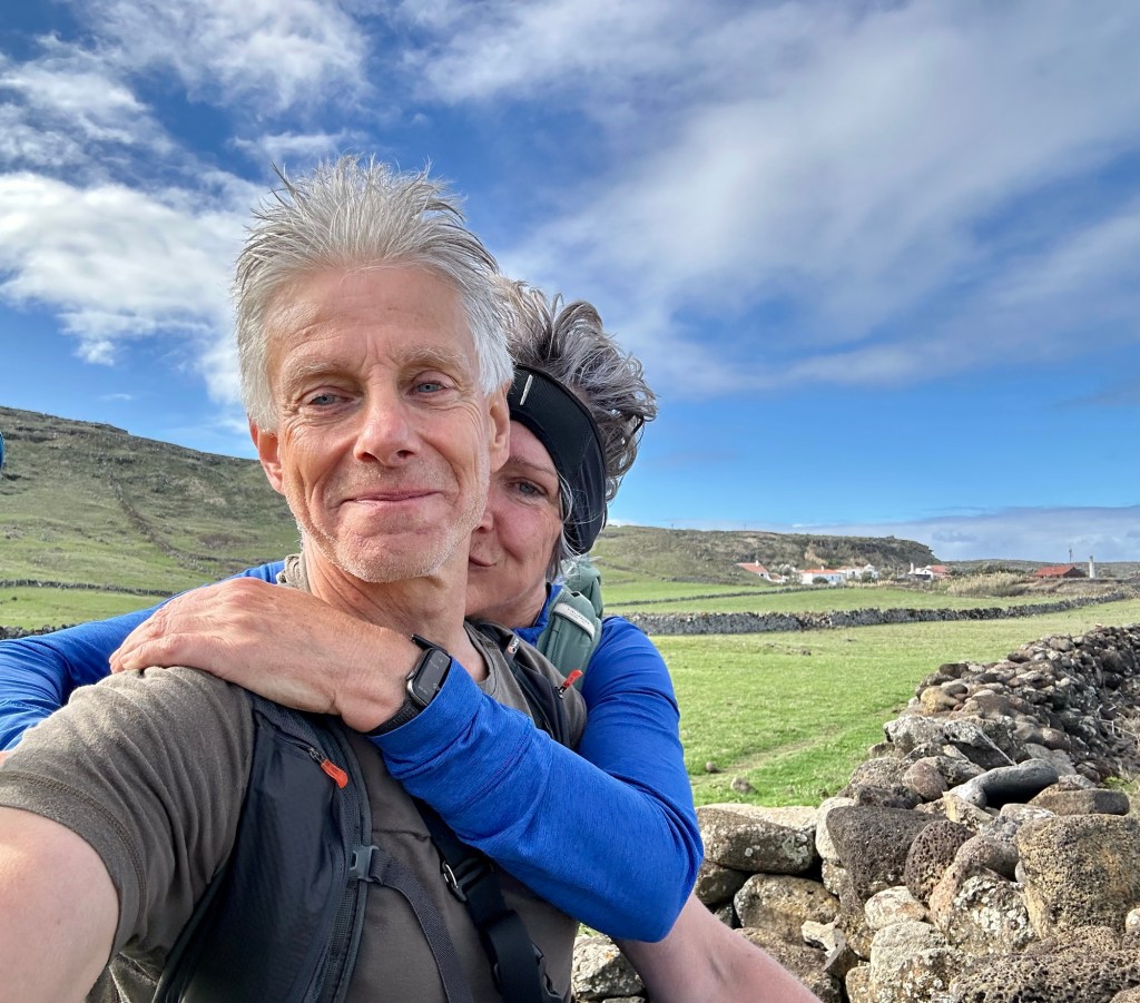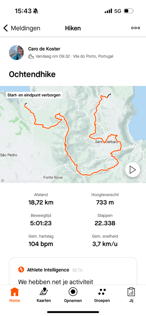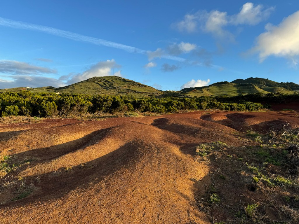 Op het rondje van ongeveer 80 km dat wij lopen op dit eiland hebben we in Santa Barbara één klein (leeg) terrasje geopend gezien. Het is onvoorstelbaar dat het hier op een ander tijdstip druk zou zijn. Toch oogt het vaak geciviliseerd, veel lege zomeronderkomens van de rijkere Portugezen wellicht, verstrooid over het hele eiland. Tegelijkertijd ook héél veel onbewoonde krotten, bouwvallen en ruïnes. Het landschap waar je over uitkijkt lijkt “bewerkt”, overal groen gras met muurtjes alsof alles is opgedeeld in kavels en óveral koeien met hun kalveren. We lopen door heel afwisselende omgevingen, bamboebossen, grasvelden, strandboulevards, door rivierbeddingen…..bospaden….heel veel heuvels op en af…allemaal niet eng, heel relaxed lopen en supergoed aangegeven. Ik vind het achter elkaar door lopen zonder hoeven nadenken waarheen fijn, dit zou ik nog wel langer willen doen.