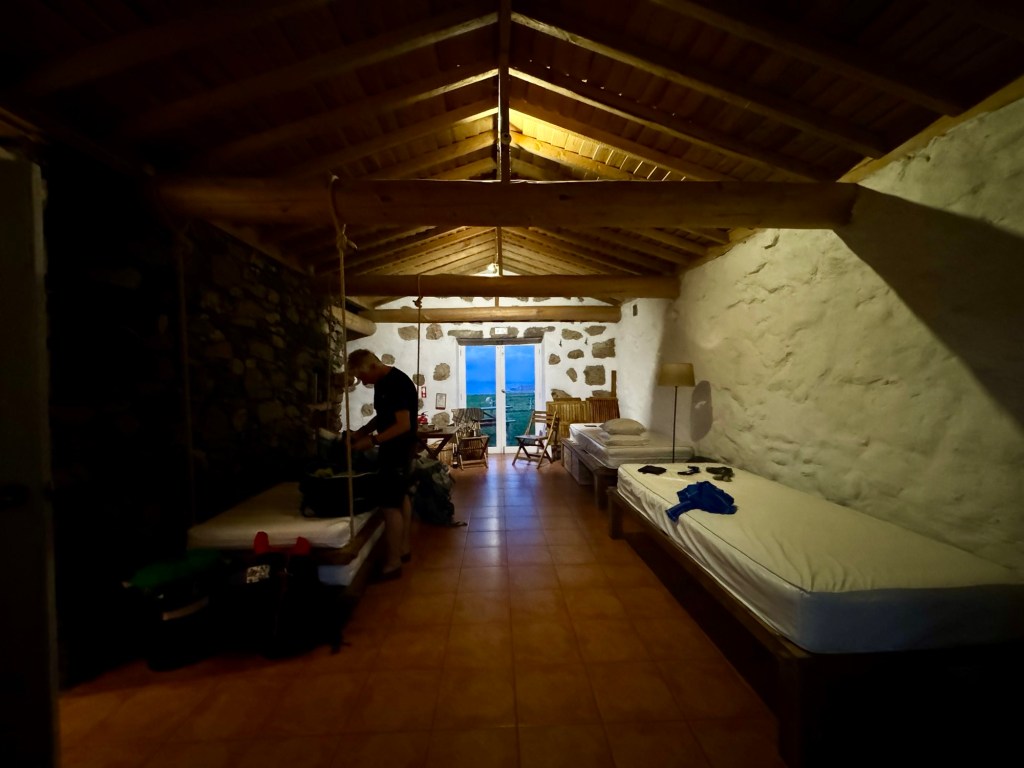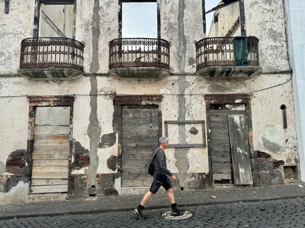 Ooit was Santa Maria een druk bezocht vliegveld voor tussenstops van intercontinentale vluchten. Nu is het compleet uitgestorven. In het vliegtuig Lisbon-Samta Maria zaten ook maar een handjevol mensen. Een taxi brengt ons binnen 5 minuten naar ons…hostel…jawel…blijkbaar in hetzelfde moment van kostenbesparing geboekt. Deze slaapplek kan ik overigens niet aanbevelen. In deze verste uithoek van het enige “stadje” op het eiland start morgen ons wandelavontuur. Ooit was het hier mooi denk ik, nu zie ik vooral vervallen huizen in een compleet uitgestorven dorp. Paul is misselijk uit de taxi gestapt en blijft dat helaas met ups en downs de rest van de week.