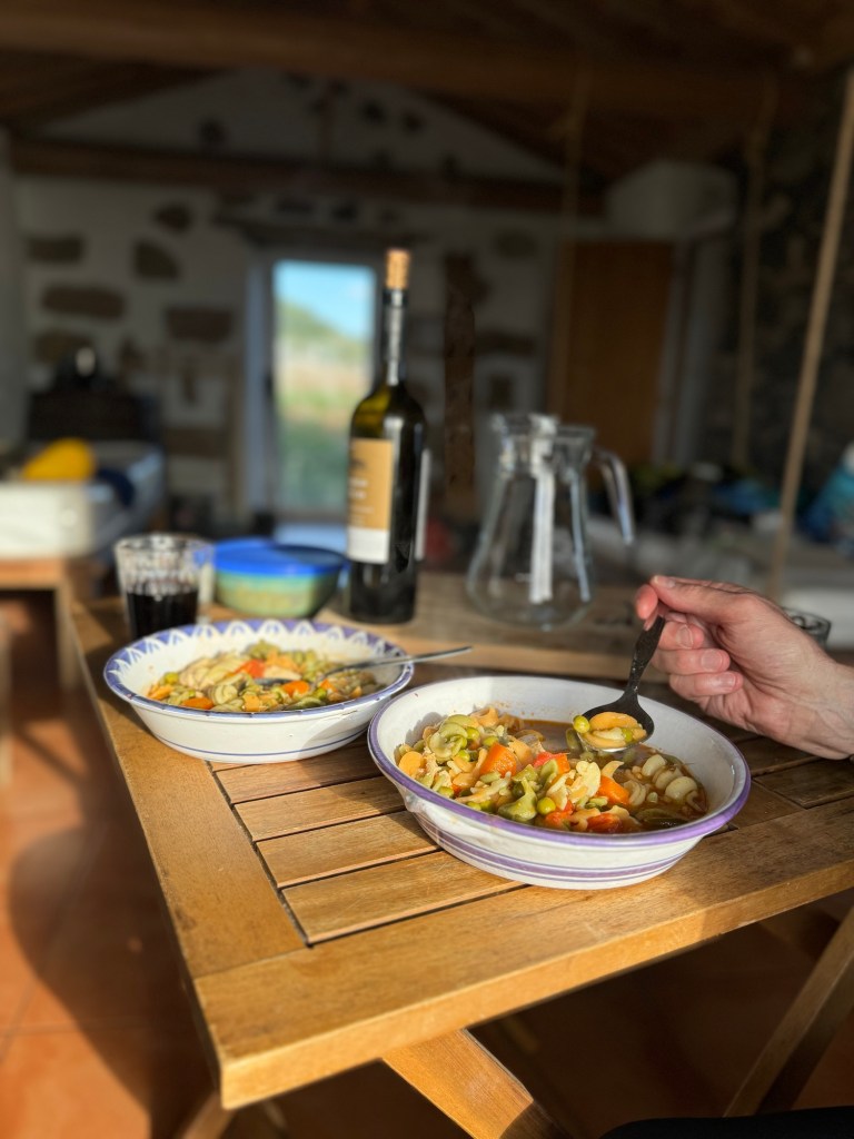 Vanaf de eerste stap zit alles mee. Het weer is boven verwachting gewéldig, perfect wandelweer. We hebben maar een keer een paar spatten, de rest valt als wij lekker binnen bij het haardvuur zitten. We komen gedurende de vijf wandeldagen één tourist tegen op de route, uit Israel, die niks weet van de hutjes van Ioannes en steeds teruglift naar “de stad” voor een bed. Alle 4 de hutten lijken op elkaar en zijn geweldig. We maken 3 keer een vuurtje in de kachel, superknus. Als we aankomen staat er een koelbox met ontbijt voor de volgende ochtend, een pannetje met maaltijdsoep, onze tassen met slaapzak en huttenkleren, je kunt douchen door het door solarpanels verwarde water in een watertank….zelfs je telefoon opladen lukt.