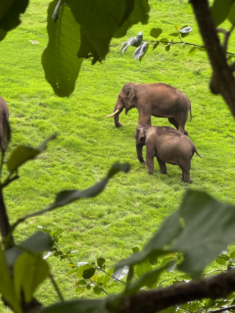 Het laatste half uur omhoog naar het topstation was prachtig, schitterende groene heuvels met allerlei patronen van theeplanten. Bovenaan op 1900m de welbekende rij kraampjes (het was ook meteen einde van de weg) met teleurstellend uitzicht, de weg erheen was vele malen mooier. Op de terugweg spotte ik in het weiland twee grijze vlekken….blijken we de in het wild levende olifanten gevonden te hebben. Dat was de kers op het gebakje….ik, die nóóit wild spot…ik die als uitzondering van alle reizigers in hetzelfde gebied nooit een noemenswaardig dier zie…ik zag nu de olifanten🐬. Na 10 minuten staren en 300 foto’s waarvan je er thuis weer 295 verwijderd…net als de meeste van de 200 groene uitzichten…weer terug in de jeep, toch wel heel blij! Echt heel blij. Dieren in het wild spotten geeft toch een bijzonder gevoel. Onze volgende reis wordt een safari in Afrika denk ik. We werden ook nog voor de deur van ons hotel afgezet, wat een topdag!