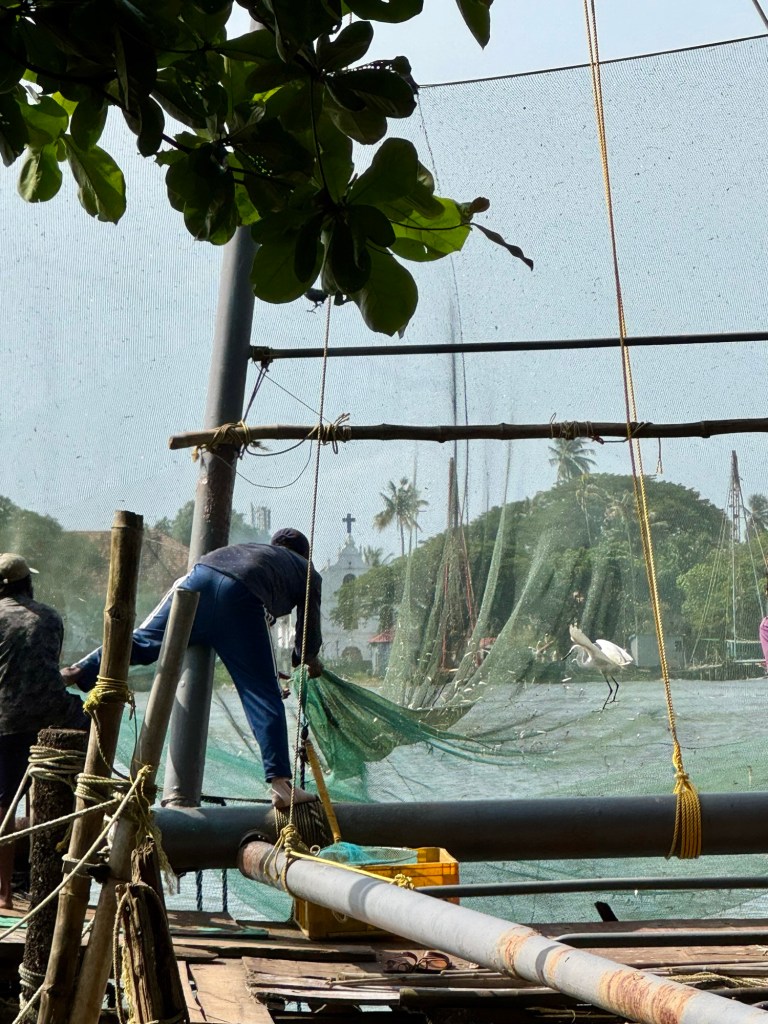 Laatste bezoek is aan Kochi, hotel in gedeelte Fort Kochi. Weer anders dan verwacht. Ik had hier wel een meer toeristisch westers sfeertje verwacht…met terrasjes enzo…niet dus. Gewoon nog steeds in India, met dezelfde rotzooi overal, vervallen “woningen/winkels/bedrijfjes”…. wel meer toeristen hier en zelfs een aantal nederlands sprekenden in ons sjieke hotel…meestal één blanke met een Indiase familie…op familiebezoek denk ik. Het was warm op zeeniveau, erg warm zelfs…zó warm dat ik gezwommen heb….in dat te strakke badpak. Én het was de eerste plek waar we alcohol konden bestellen. We durfden bijna niet meer, bang dat het pijn zou doen na die hele ontgifting. De wijn was duurder dan het hotel zelf…ik wist dat niet dat alcohol in India zo moeilijk was.